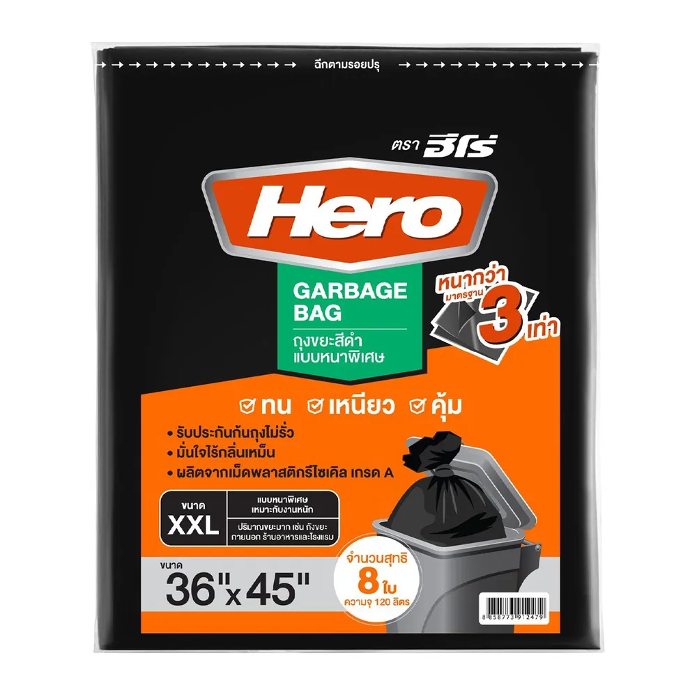 <p>ฮีโร่ ถุงขยะหนา 3 เท่า ขนาด 36 x 45 นิ้ว สีดำ 8 ใบ<br />