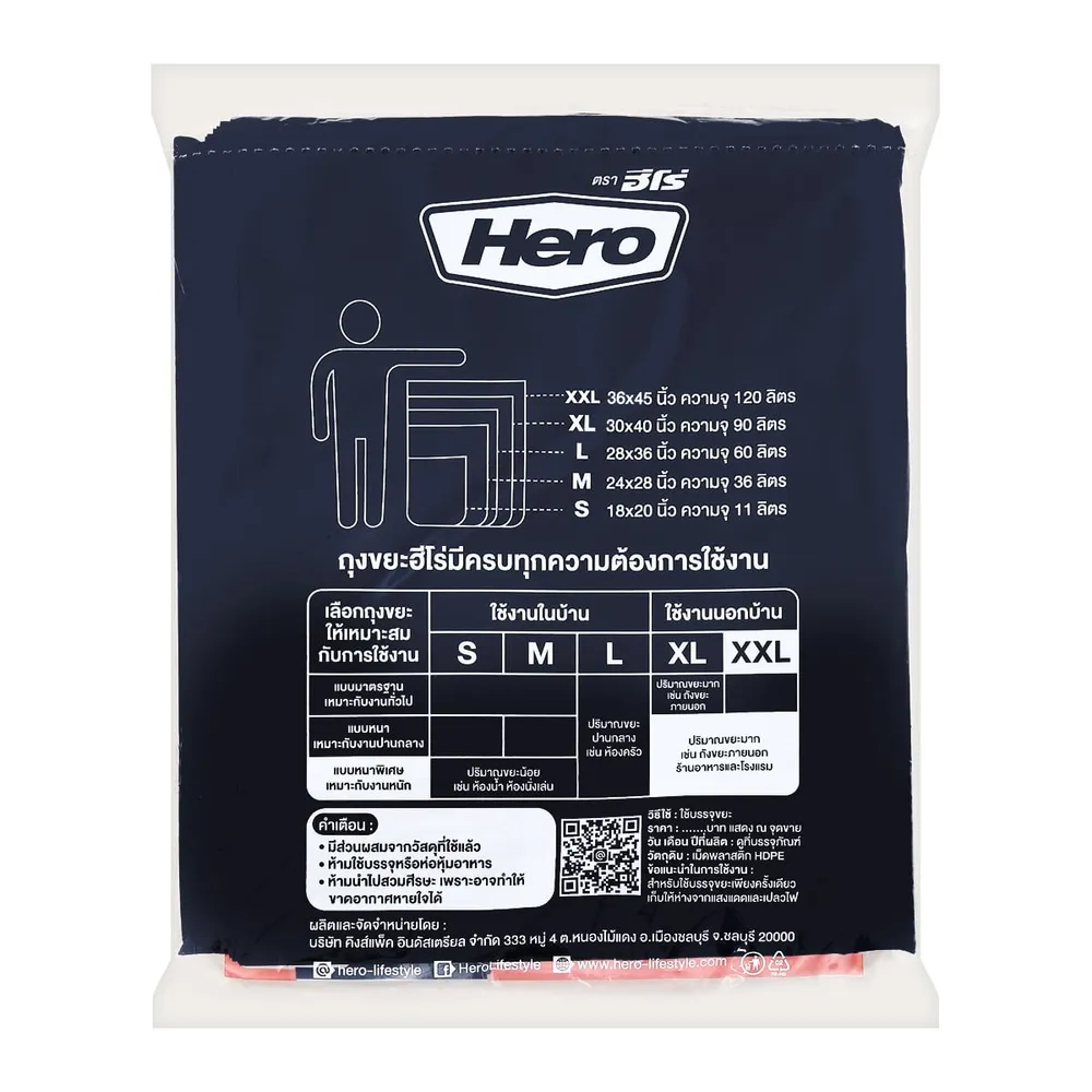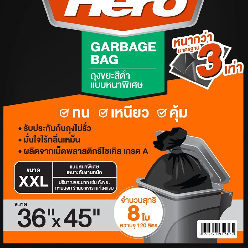 ฮีโร่ ถุงขยะ สีดำ แบบหนาพิเศษถึง 3 เท่า มีความหนา เหนียว ไม่ขาดง่าย ก้นถุงต้ดตรง ไม่รั่วซึม รับประกันไม่มีกลิ่นเหม็น<br />