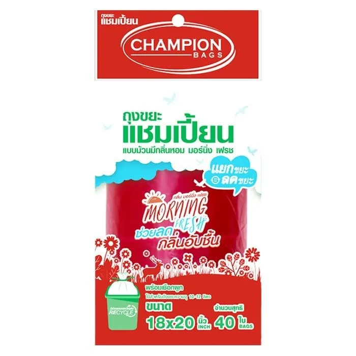 แชมเปี้ยน ถุงขยะแบบม้วน ถุงขยะคุณภาพเยี่ยมจากแบรนด์ แชมเปี้ยน ที่ผลิตจากวัสดุคุณภาพดี มีกลิ่นหอม มอร์นิ่ง เฟรช ช่วยลดกลิ่นอับชื้น เนื้อเหนียว แข็งแรง ทนทาน ใช้งานได้นาน<br />