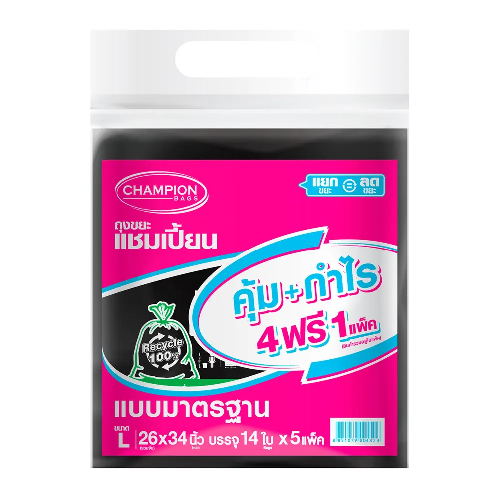 แชมเปี้ยน ถุงขยะ แบบมาตรฐาน ขนาด 26 x 34 นิ้ว 14 ใบ แพ็ค 4 แถม 1