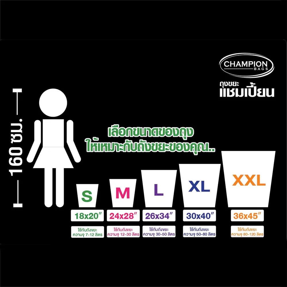 แชมเปี้ยน ถุงขยะ แบบมาตรฐาน ปากเรียบ ก้นถุงตัดตรง ผลิตจากเม็ดพลาสติกรีไซเคิล 100 % ช่วยลดการใช้เม็ดพลาสติกใหม่<br />