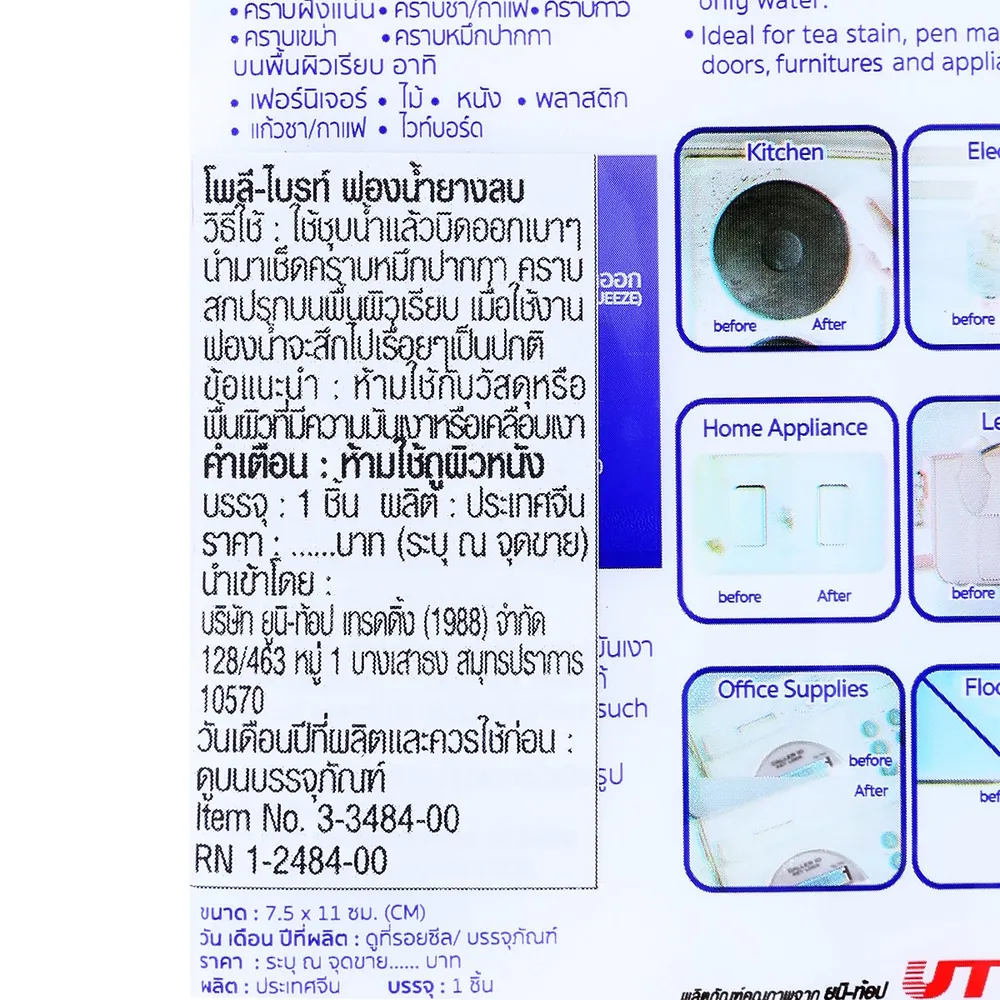 - วิธีใช้ : ใช้ชุบน้ำแล้วบิดออกเบา ๆ นำมาเช็ดคราบหมึกปากกา คราบสกปรกบนพื้นผิวเรียบ เมื่อใช้งานฟองน้ำจะสึกไปเรื่อย ๆ เป็นปกติ<br />