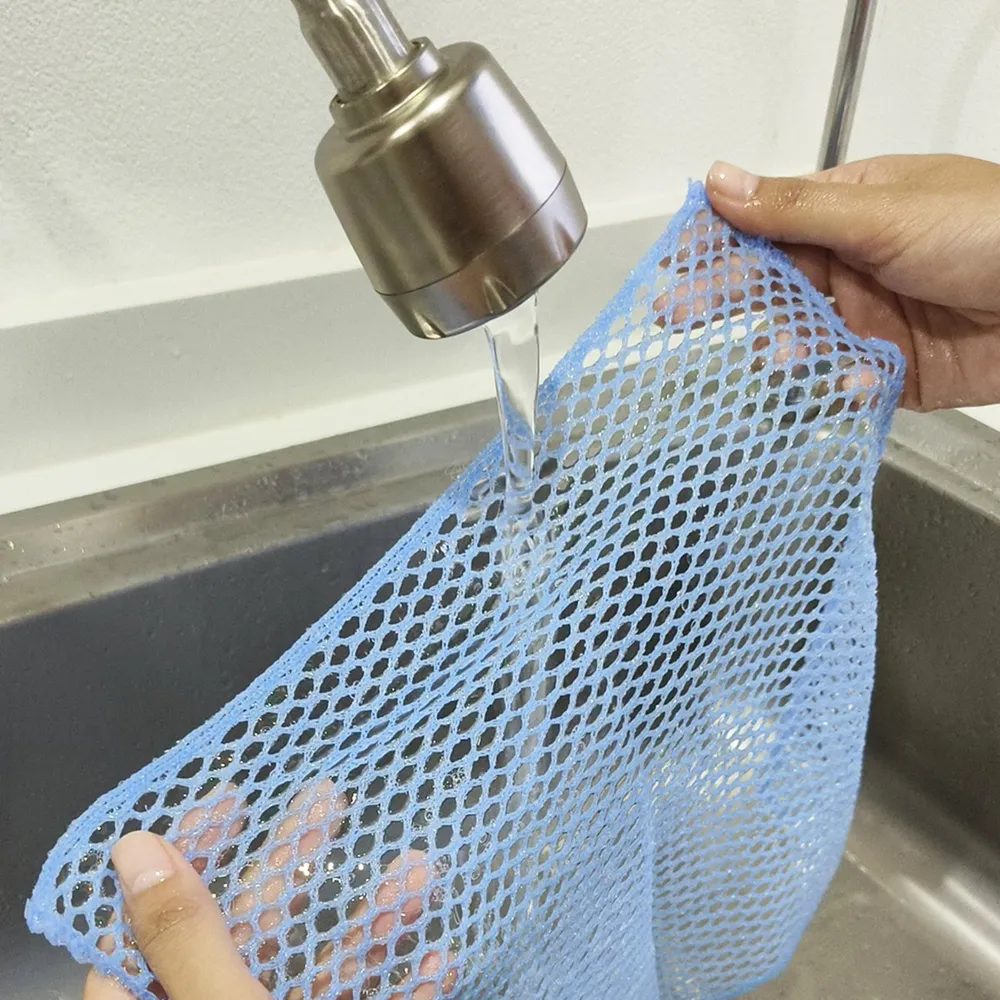 โพลี ไบรท์ ผ้าตาข่ายล้างจาน ช่องตาข่ายใหญ่ขัดล้างสะอาด ไม่สะสมเศษอาหาร ล้างเศษอาหารออกจากผ้าได้ง่าย แห้งไว ลดกลิ่นอับชื้นและแบคทีเรีย<br />