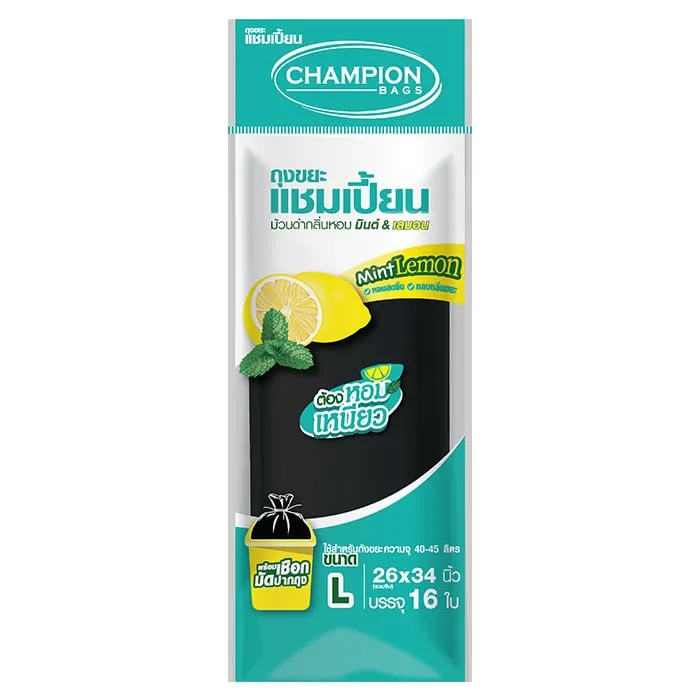 แชมเปี้ยน ถุงขยะสีดำ แบบม้วน กลิ่นมินต์&เลมอน 26x34 นิ้ว แพ็ค 16 ใบ