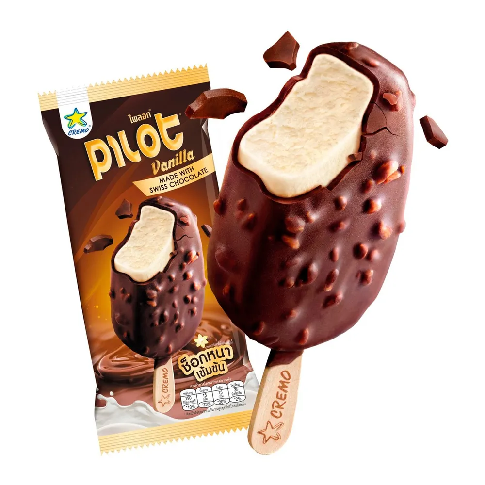 ครีโม ไพลอต วานิลลา เนื้อไอศครีมวานิลลา เคลือบด้วยช็อกโกแลตนำเข้าจากฝรั่งเศสและถั่วคุณภาพดี ผลิตจากวัตถุดิบชั้นดี ที่ถูกคัดสรรมาเพื่อคุณโดยเฉพาะ รสชาติอร่อย เข้มข้น<br />