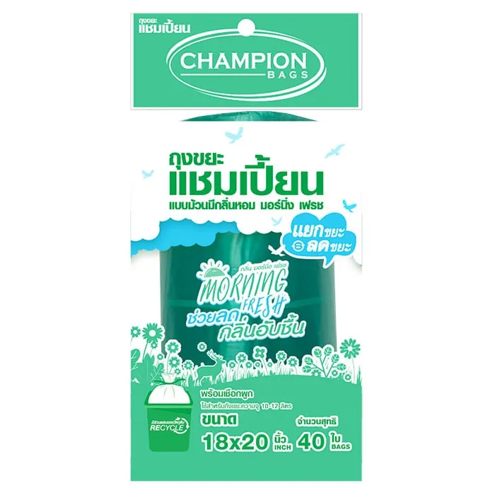 แชมเปี้ยน ถุงขยะแบบม้วน ถุงขยะคุณภาพเยี่ยมจากแบรนด์ แชมเปี้ยน ที่ผลิตจากวัสดุคุณภาพดี มีกลิ่นหอม มอร์นิ่ง เฟรช ช่วยลดกลิ่นอับชื้น เนื้อเหนียว แข็งแรง ทนทาน ใช้งานได้นาน<br />