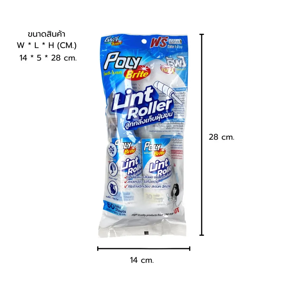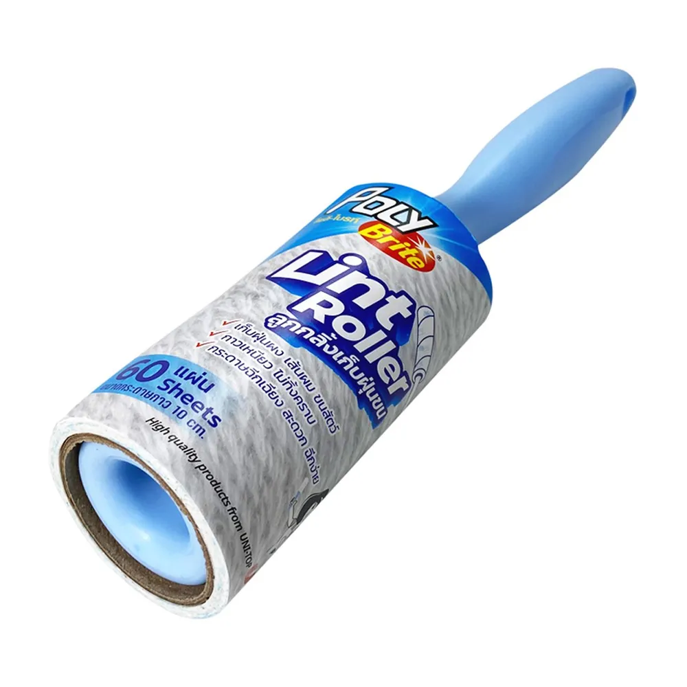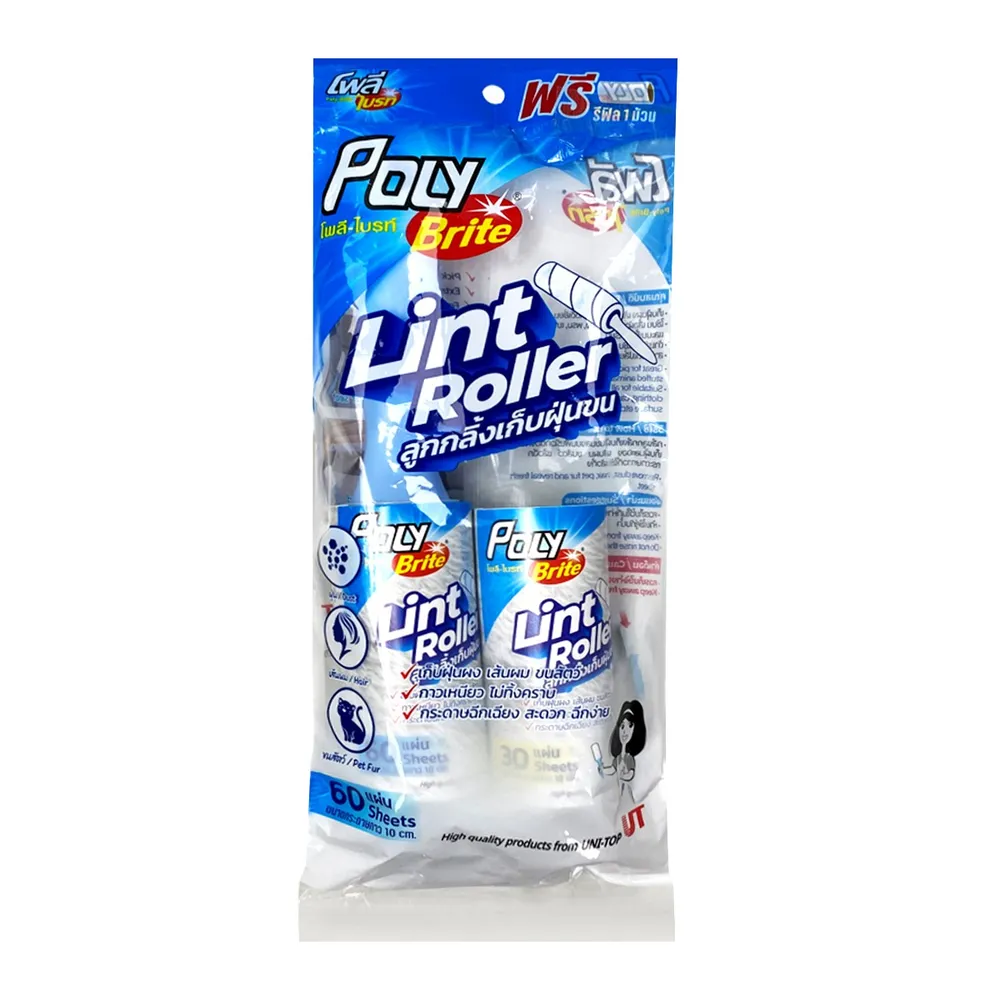 โพลี ไบรท์ ลูกกลิ้งใช้เก็บฝุ่นผง เส้นผม ขนสัตว์ &nbsp;ใช้บนเสื้อผ้า, โซฟา, เตียง, พรม, เบาะรถยนต์ และบนพื้นผิวเรียบ ด้ามจับกระชับ ถนัดมือ สามารถเปลี่ยนรีฟิลได้ กาวเหนียว ไม่ทิ้งคราบ กระดาษฉีกเฉียง สะดวก ฉีกง่าย<br />