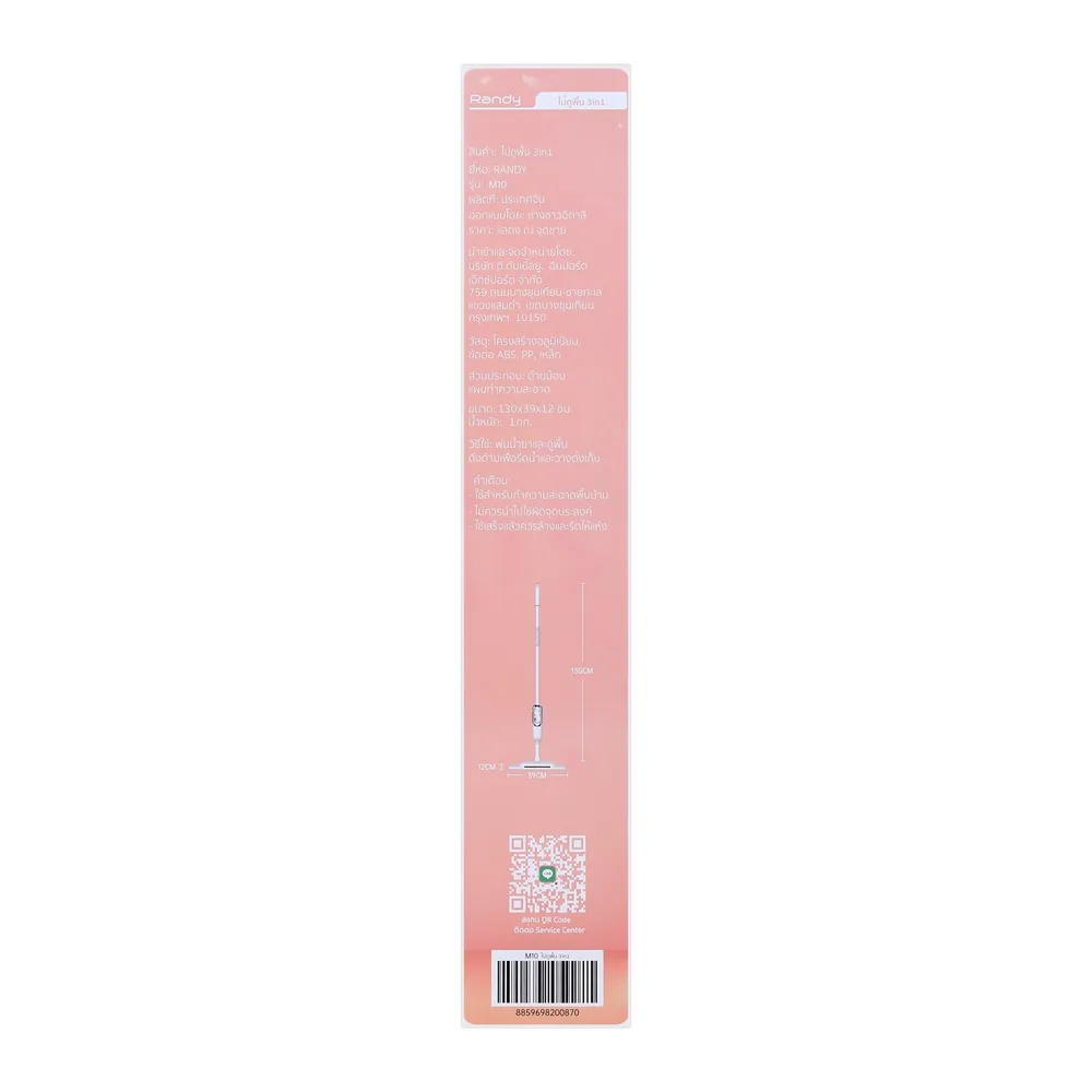 <p>แรนดี้ ไม้ถูพื้น 3อิน1 รุ่น M10<br /><br />RANDY ไม้ถูพื้นเกรดพรีเมียม ออกแบบโดยดีไซน์เนอร์ฝรั่งเศส ไม้ถูพื้น+ไม้กวาดดันฝุ่นที่มีที่ฉีดน้ำ ไม้ถูพื้นหัวแบนหมุนได้ 360 องศา เหมาะกับทุกไลฟ์สไตล์และการใช้ชีวิตของผู้คน พร้อมช่วยประหยัดเวลาในการทำความสะอาดบ้าน<br /><br />- RANDY ไม้ถู 3อิน1 สะอาดครบไม่ต้องพกหลายอุปกรณ์<br />- กวาด ถู พ่นน้ำยาในตัวเดียวกัน ช่วยให้พื้นบ้านของคุณสะอาดขึ้น แถมประหยัดเวลาในการทำงานบ้าน<br />- เปลี่ยนไม้ถูเป็นไม้กวาดได้อย่างง่ายดาย<br />- ดูดขยะและเก็บฝุ่นอัตโนมัติ<br />- ม็อบกวาดพื้นแบบลูกกลิ้งสูญญากาศ<br />- เข้าถึงได้ทุกพื้นที่ ทำความสะอาดได้ทุกมุมอับ<br />- กล่องเก็บฝุ่นจุได้เยอะมากถึง 350 มล.<br />- น้ำหนักเบาไม่เมื่อยแขนเพียง 0.98 กก.<br /><br /><img src="https://st.bigc-cs.com/public/static/media/uploads/2024/04/8859698200870-01-jpg" alt="" width="500" /><br /><br /><strong>คุณสมบัติจำเพาะ</strong><br />รุ่น : M10<br />วัสุด : Iron Tube + PP + ABS + Microfiber<br />น้ำหนัก : 0.98 กก.<br />ขนาด : 130 x 39 x 120 ซม.<br /><br />*สีของสินค้าอาจมีความแตกต่าง ขึ้นอยู่กับการตั้งค่าของแต่ละหน้าจอ และภาพประกอบใช้เพื่อการโฆษณาเท่านั้น</p>