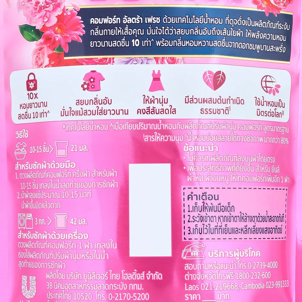 คอมฟอร์ท ฟลอรัล เฟรช ผลิตภัณฑ์ปรับผ้านุ่ม สูตรเข้มข้นพิเศษ อัลตร้า สีชมพู เพื่อผ้านุ่มน่าสัมผัส พร้อมกลิ่นหอมสดชื่นด้วยเทคโนโลยีกระจายความหอมสูตรใหม่ล่าสุด ทำให้ผ้าหอมสดชื่นยาวนาน ทำให้การซักผ้าเป็นเรื่องง่าย หมดปัญหาผ้าลีบ มีกลิ่น มั่นใจทุกครั้งที่ใช้<br />