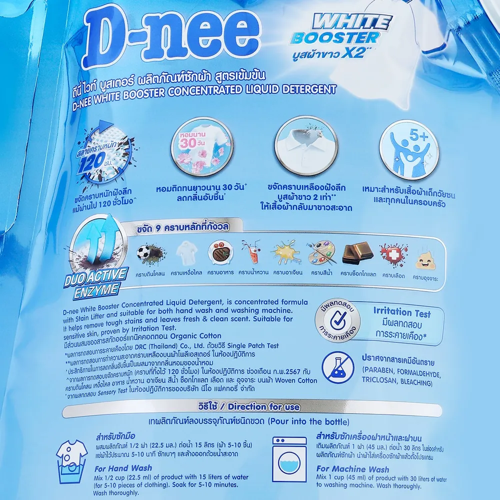 ดีนี่ ไวท์ บูสเตอร์ ผลิตภัณฑ์ซักผ้า สูตรเข้มข้น ปกป้องเสื้อผ้าจากกลิ่นอับชื้น แม้ตากในที่ร่มหรือซักกลางคืน สลายคราบหนักฝังแน่นแม้ผ่านไป 120 ชั่วโมง<br />