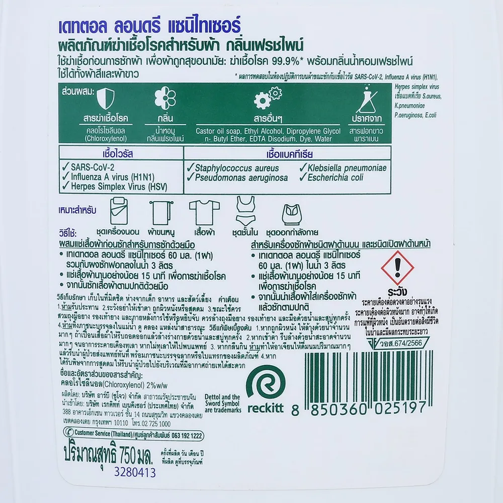 เดทตอล ลอนดรี แซนิไทเซอร์ ผลิตภัณฑ์ฆ่าเชื้อแบคทีเรียสำหรับเสื้อผ้า 750 มล.