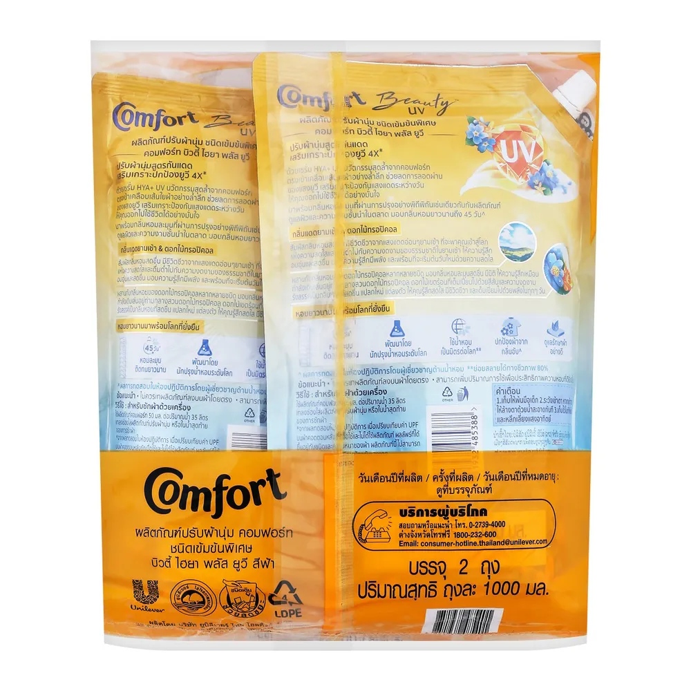 คอมฟอร์ท บิวตี้ ไฮยา พลัส ยูวี ผลิตภัณฑ์ปรับผ้านุ่ม กลิ่นแดดยามเช้า & ดอกไม้ทรอปิคอล 1000 มล. แพ็ค 1+1 ชิ้น