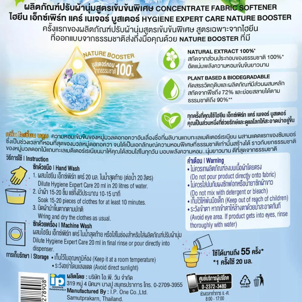 ผ้าหอมสดชื่นด้วย ไฮยีน ผลิตภัณฑ์ปรับผ้านุ่ม สูตรเข้มข้นพิเศษ กลิ่นโอเชี่ยน บลูม ผลิตภัณฑ์น้ำยาปรับผ้านุ่มคุณภาพจากแบรนด์ ไฮยีน ที่ผลิตการสกัดส่วนประกอบจากธรรมชาติ กลิ่นหอมเฉพาะจากดอกอควา ฟลาวเวอร์ แถบทะเลเมดิเตอร์เรเนียน ผ้านุ่ม หอม ยาวนาน<br />