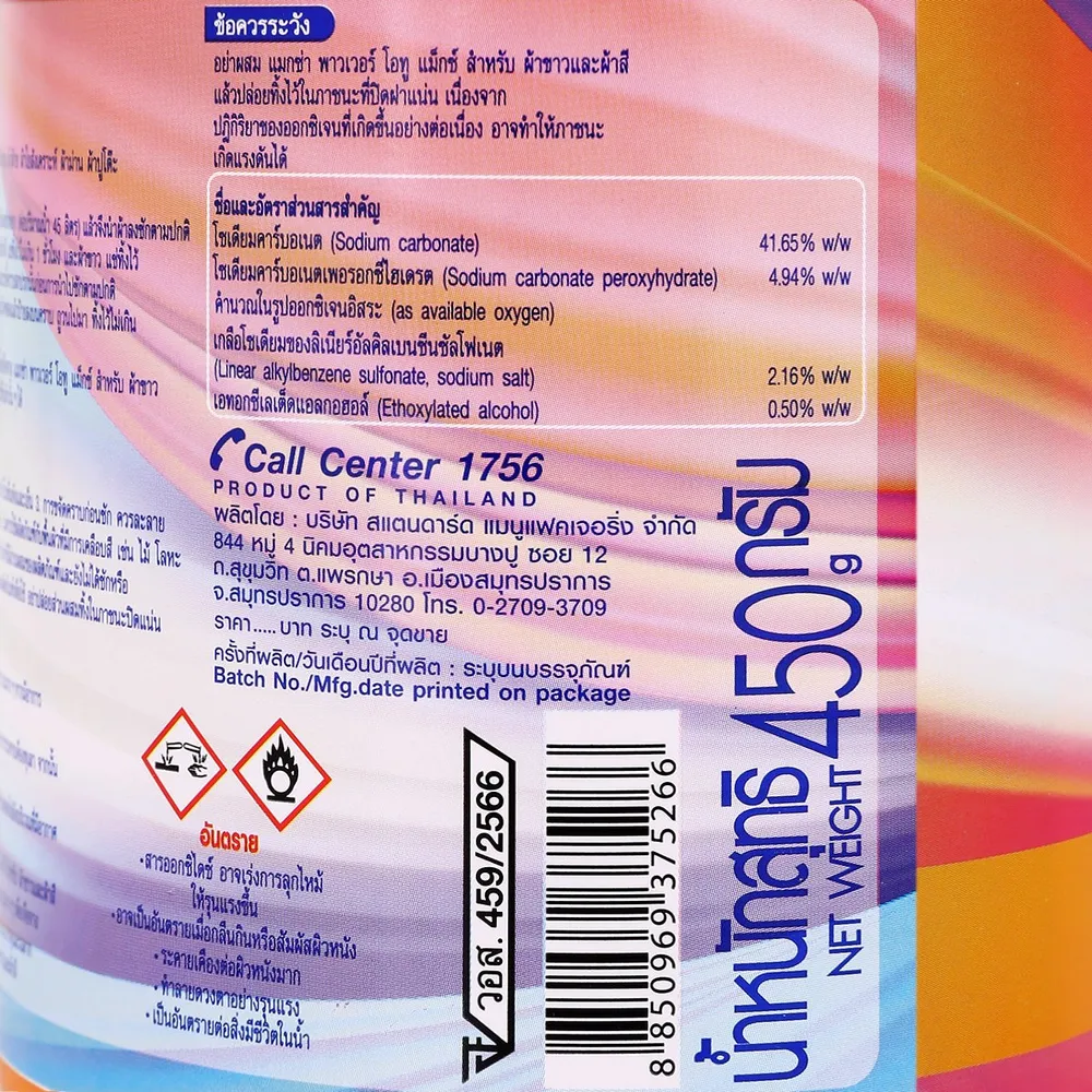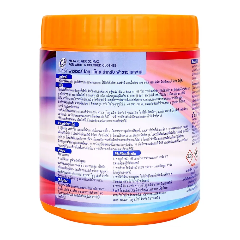 <p>แมกซ่า พาวเวอร์โอทูแม็กซ์ สำหรับผ้าขาวและผ้าสี 450 ก.<br /> <br /> แมกซ่า พาวเวอร์โอทูแม็กซ์ ผลิตภัณฑ์สูตรสำหรับผ้าขาวและผ้าสี ใช้ขจัดคราบสกปรกที่ซักออกยาก และใช้ได้กับเนื้อผ้าหลากหลายชนิด<br /> <br /> - มี Clorine Bleach Free ช่วยขจัดคราบฝังแน่น มีเอมไซม์โปรติเอส ช่วยสลายคราบโปรตีน และเลือด<br /> - พลังออกซิเจน สลายคราบฝังแน่น<br /> - เลขที่ อย. วอส.459/2566<br /> <br /> <br /> *ภาพประกอบใช้เพื่อการโฆษณาเท่านั้น</p> <br><span style="color: #ff0000;">*บริษัทฯ ขอสงวนสิทธิ์ในการปรับเปลี่ยนราคาจำหน่ายและโปรโมชั่น รวมถึงแพ็คเกจและปริมาณสินค้าจากผู้ผลิตได้ตามความเหมาะสม โดยไม่จำเป็นต้องแจ้งให้ทราบล่วงหน้า </span><br />