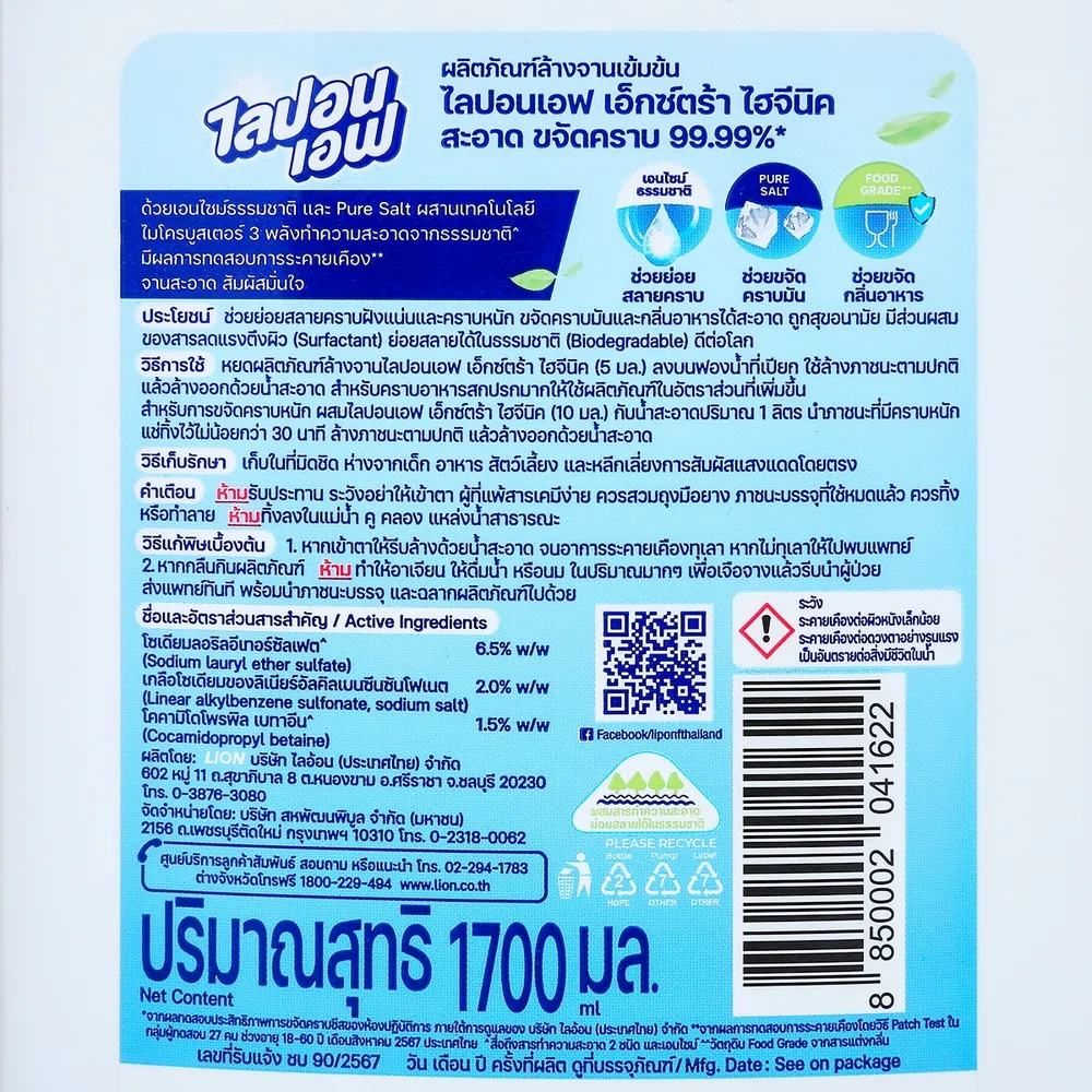 <p>ไลปอนเอฟ ผลิตภัณฑ์ล้างจาน สูตรเอ็กซ์ตร้า ไฮจีนิค 1700 มล.<br />