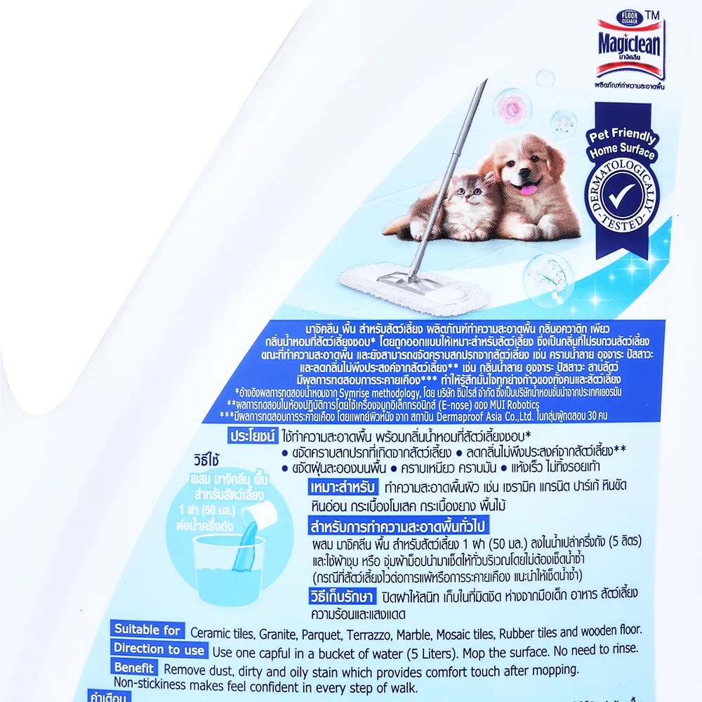 มาจิคลีน พื้น สำหรับสัตว์เลี้ยง ผลิตภัณฑ์ทำความสะอาดพื้น กลิ่นอควาติกเพียว กลิ่นน้ำหอมที่สัตว์เลี้ยงชอบ* โดยถูกออกแบบให้เหมาะสำหรับสัตว์เลี้ยง ซึ่งเป็นกลิ่นที่ไม่รบกวนสัตว์เลี้ยงขณะที่ทำความสะอาดพื้น<br />
