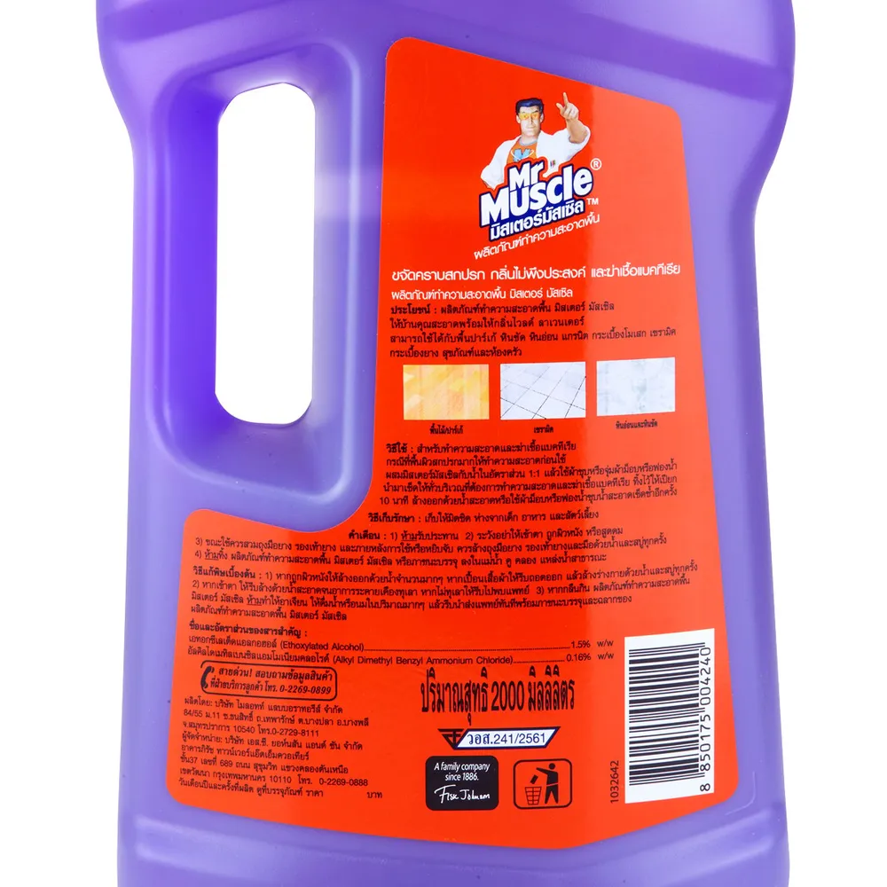 มิสเตอร์มัสเซิล ผลิตภัณฑ์ทำความสะอาดพื้น กลิ่นไวลด์ ลาเวนเดอร์ ผลิตภัณฑ์ทำความสะอาดพื้นที่มาพร้อมประสิทธิภาพของสารเจิร์มเอ๊กซ์ ที่นอกจากจะช่วยให้บ้านคุณสะอาดแล้ว ยังสามารถฆ่าเชื้อแบคทีเรียได้ในขั้นตอนเดียว อีกทั้งยังสามารถใช้ได้กับทั้งพื้นปาร์เก้ หินขัด หินอ่อน แกรนิต กระเบื้องโมเสก เซรามิค กระเบื้องยาง รวมทั้งการทำความสะอาดสุขภัณฑ์และห้องครัวอีกด้วย<br />