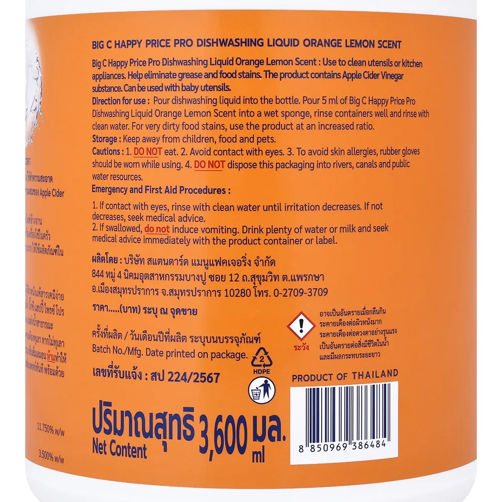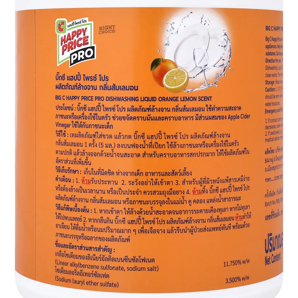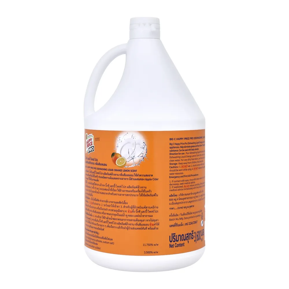 บิ๊กซี แฮปปี้ ไพรซ์ โปร น้ำยาล้างจาน กลิ่นส้มเลมอน 3600 มล.