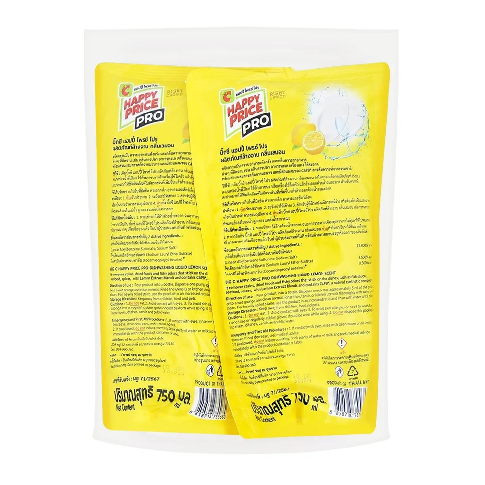 บิ๊กซี แฮปปี้ ไพรซ์ โปร ผลิตภัณฑ์ล้างจาน กลิ่นเลมอน ถุงเติม 750 มล. x 2 ชิ้น