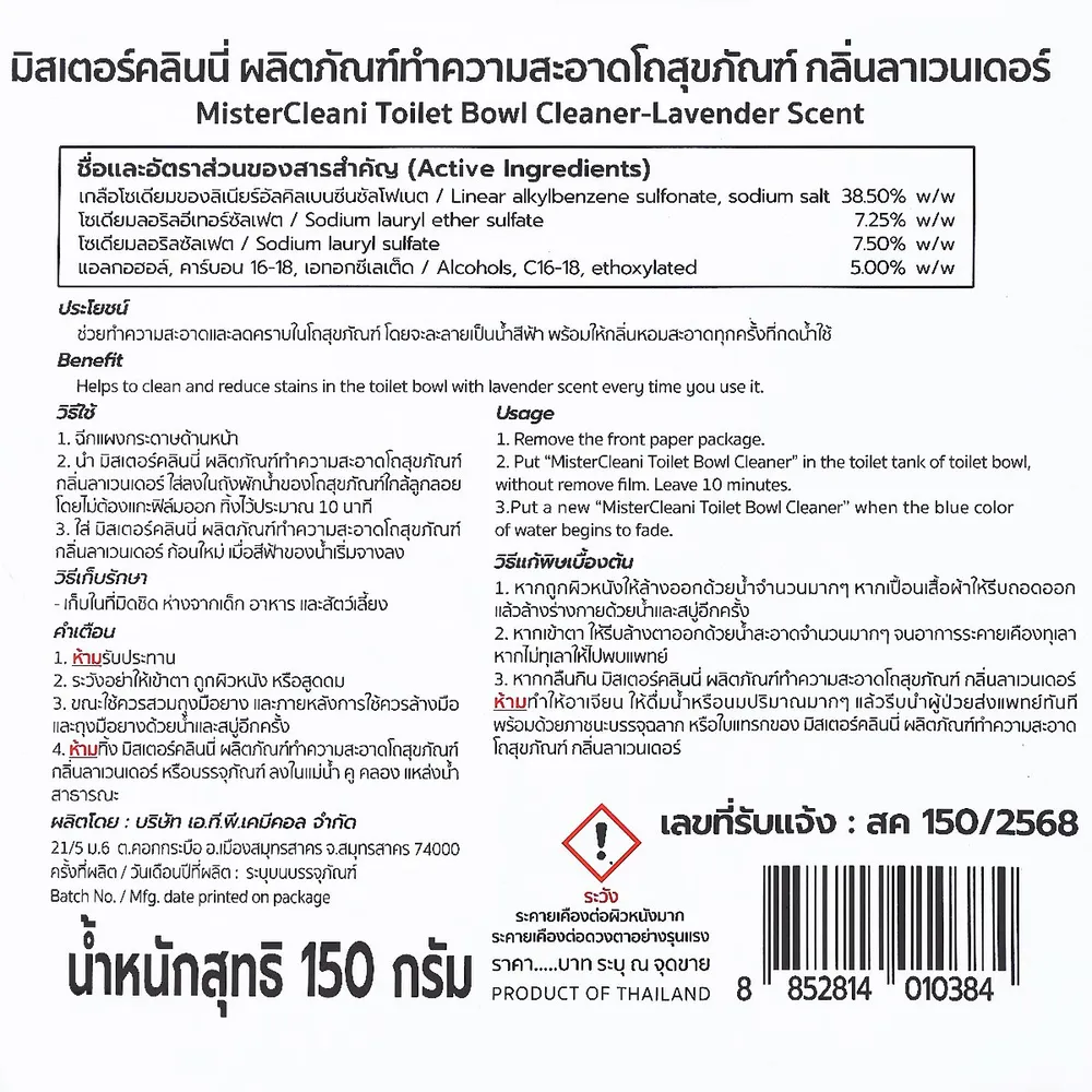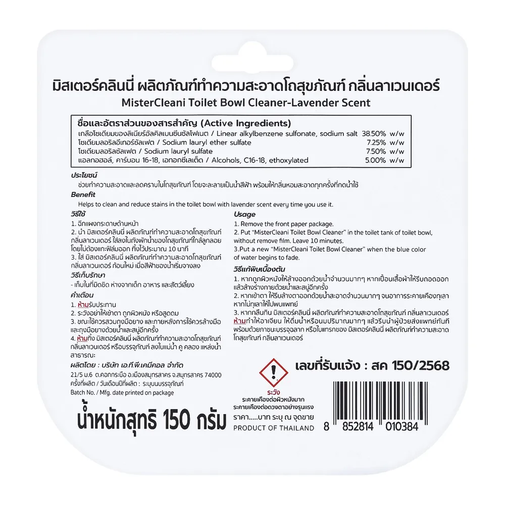 มิสเตอร์คลินนี่ ผลิตภัณฑ์ทำความสะอาดโถสุขภัณฑ์ กลิ่นลาเวนเดอร์ 150 ก.