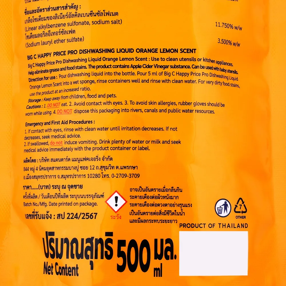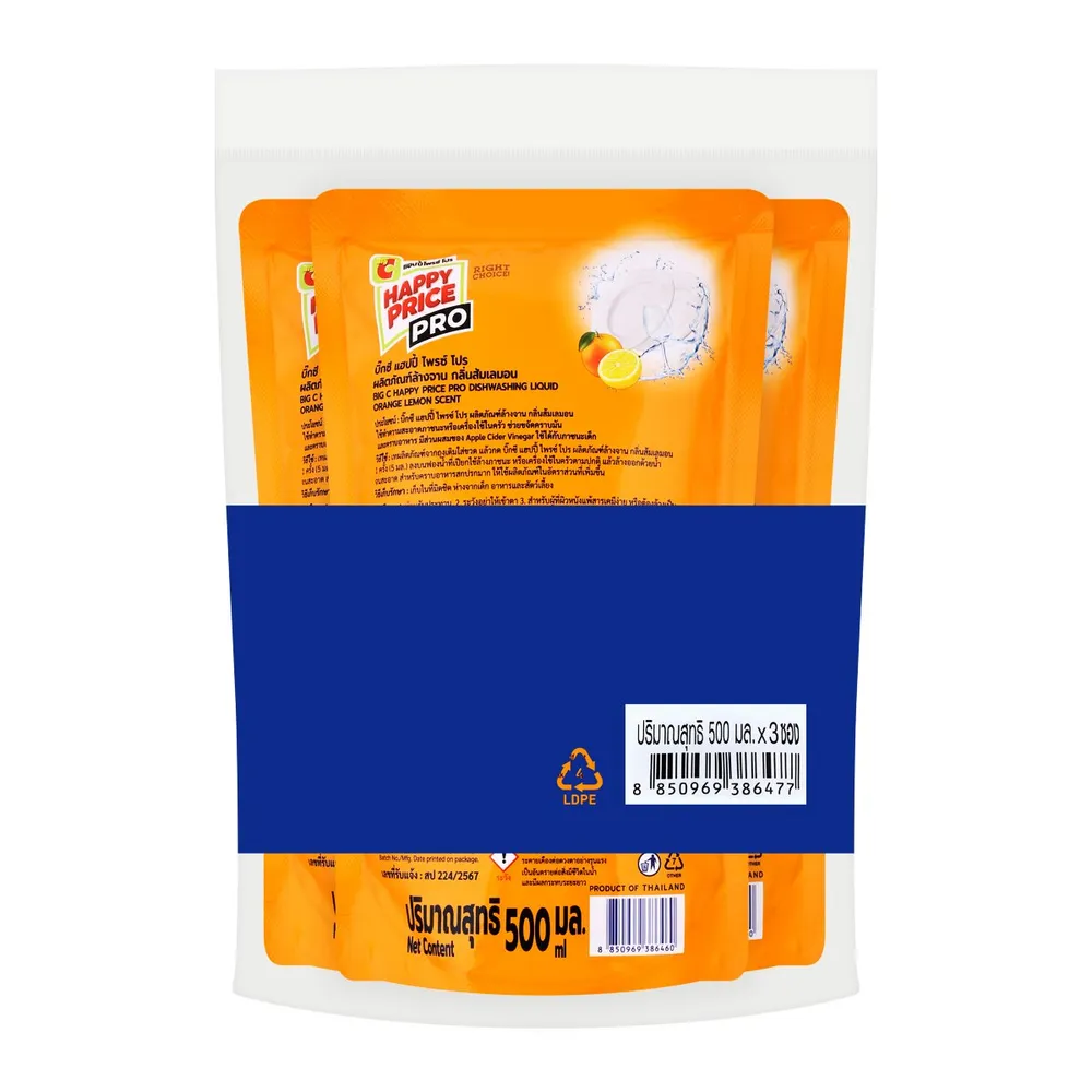 บิ๊กซี แฮปปี้ ไพรซ์ โปร น้ำยาล้างจาน กลิ่นส้มเลมอน 500 มล. แพ็ค 3