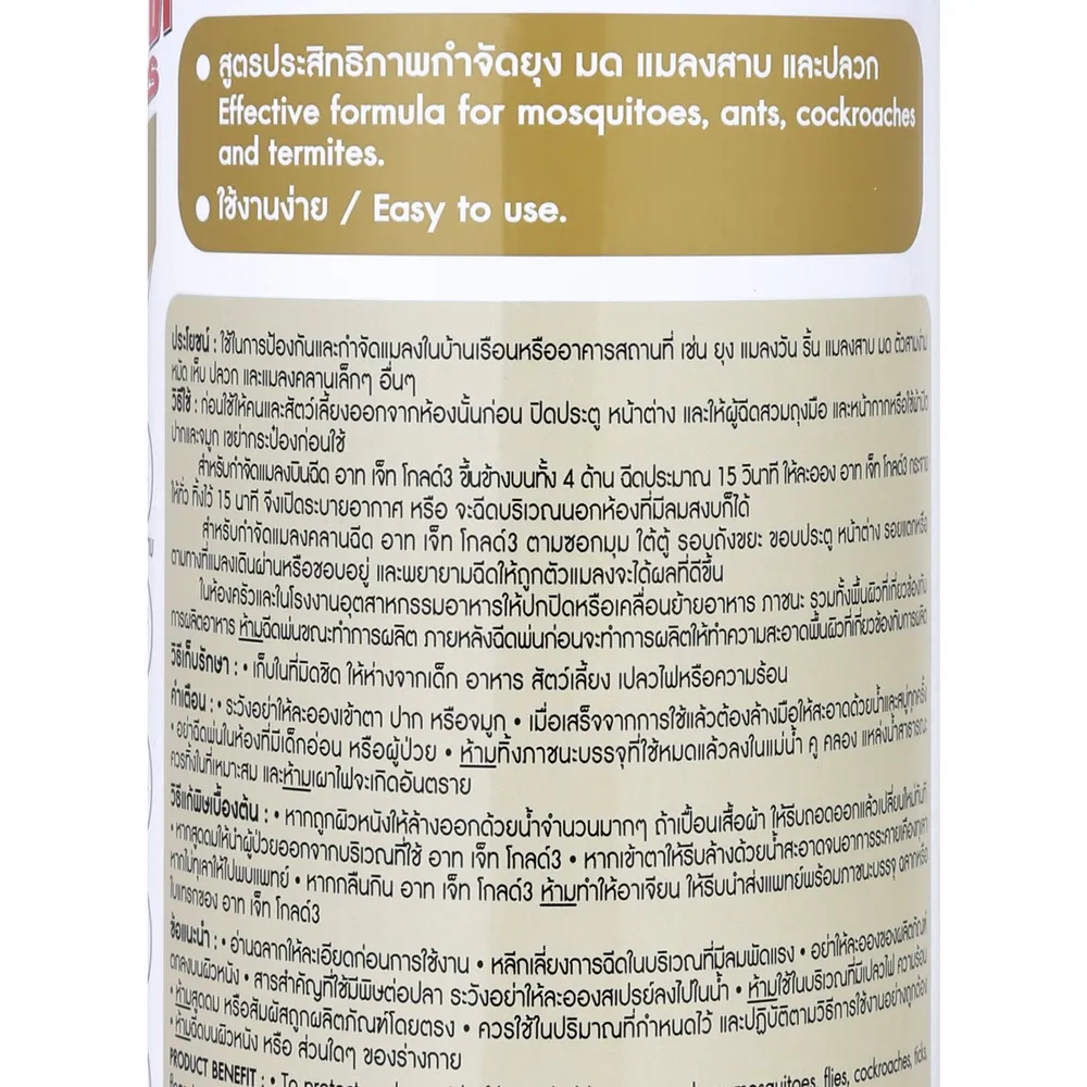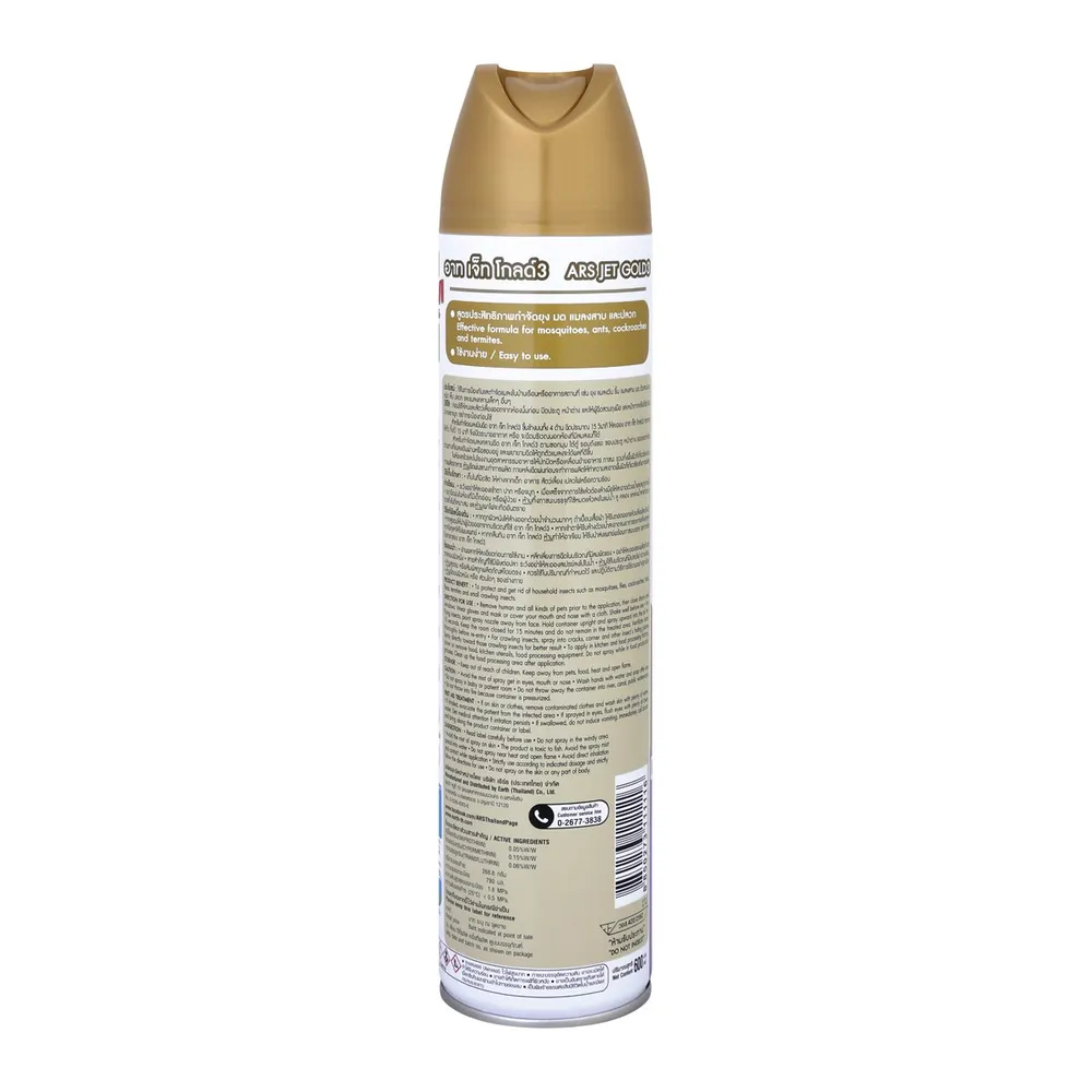 กำจัดแมลงร้ายก่อกวนบ้านของคุณด้วยอาท เจ็ทโกลด์ สเปรย์กำจัดแมลง ยุง มด แมลงสาบ กลิ่นลาเวนเดอร์ ขนาด 600 มิลลิลิตร สูตรประสิทธิภาพ กำจัดได้เร็วขึ้นกว่าปกติ 2 เท่า ใช้สารเคมีกลุ่มไพรีทรอยด์ ออกฤทธิ์กำจัดแมลงสาบ ยุง มดและแมลงอื่นๆ มาพร้อมหัวฉีดพิเศษ พ่นได้โดยไม่ต้องเปิดฝา<br />