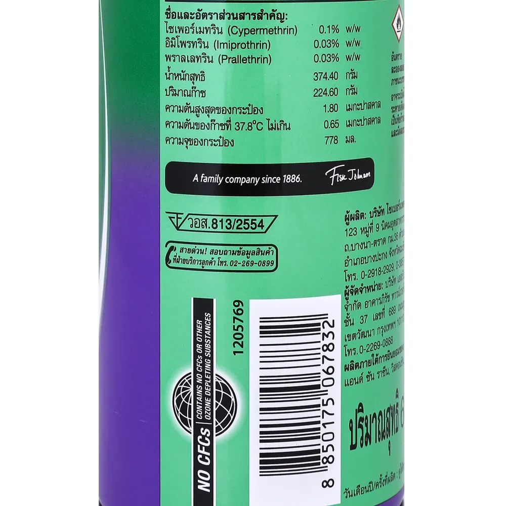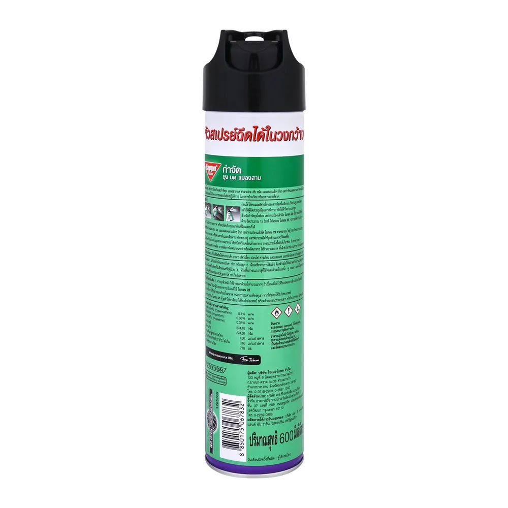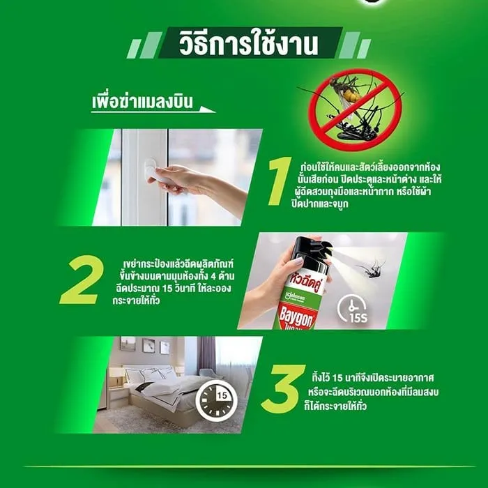 - วิธีใช้ ก่อนใช้ให้คนและสัตว์เลี้ยงออกจากห้องนั้นเสียก่อน ปิดประตูและหน้าต่าง แล้วให้ผู้ฉีดสวมถุงมือและหน้ากาก หรือใช้ผ้าปิดปากและจมูก<br />