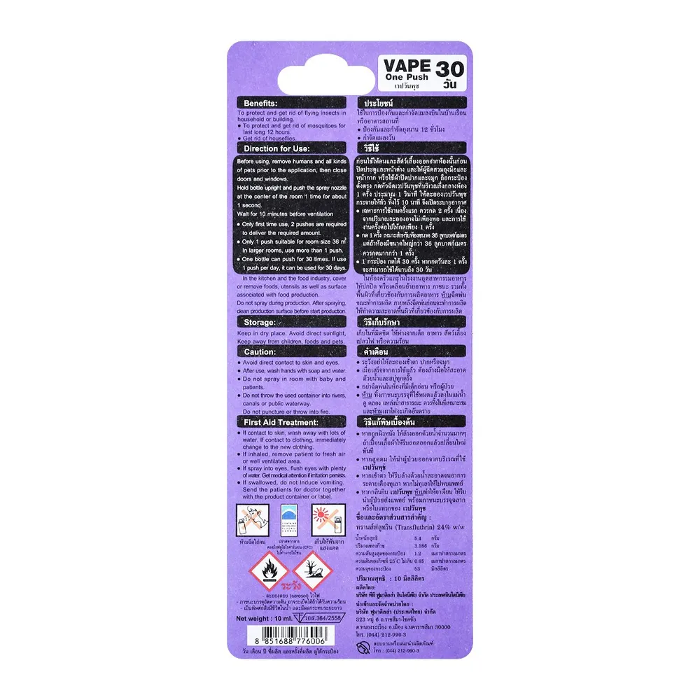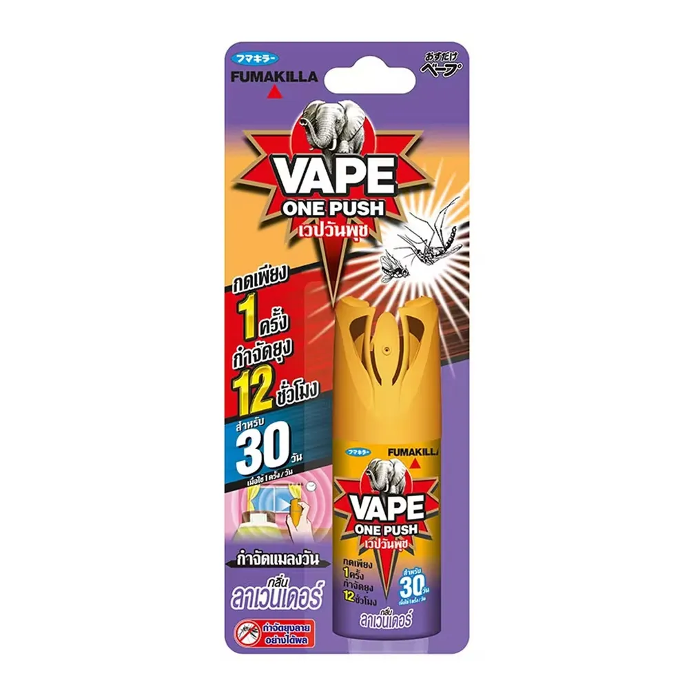 เวป วันพุช สเปรย์กำจัดยุง กลิ่นลาเวนเดอร์ ผลิตภัณฑ์กำจัดยุงนวัตกรรมใหม่จากญี่ปุ่น กดเพียง 1 ครั้ง สามารถกำจัดยุงได้นาน 12 ชั่วโมง ปลอดภัยไม่มีสารตกค้าง โดยมีลักษณะเป็นก๊าซ สามารถระเหยออกทางเหงื่อและปัสสาวะทั้งคนและสัตว์เลี้ยง อีกทั้งยังสามารถอยู่ในห้องได้ขณะฉีดสเปรย์ 1 กระป๋องใช้ได้ถึง 30 ครั้ง<br />