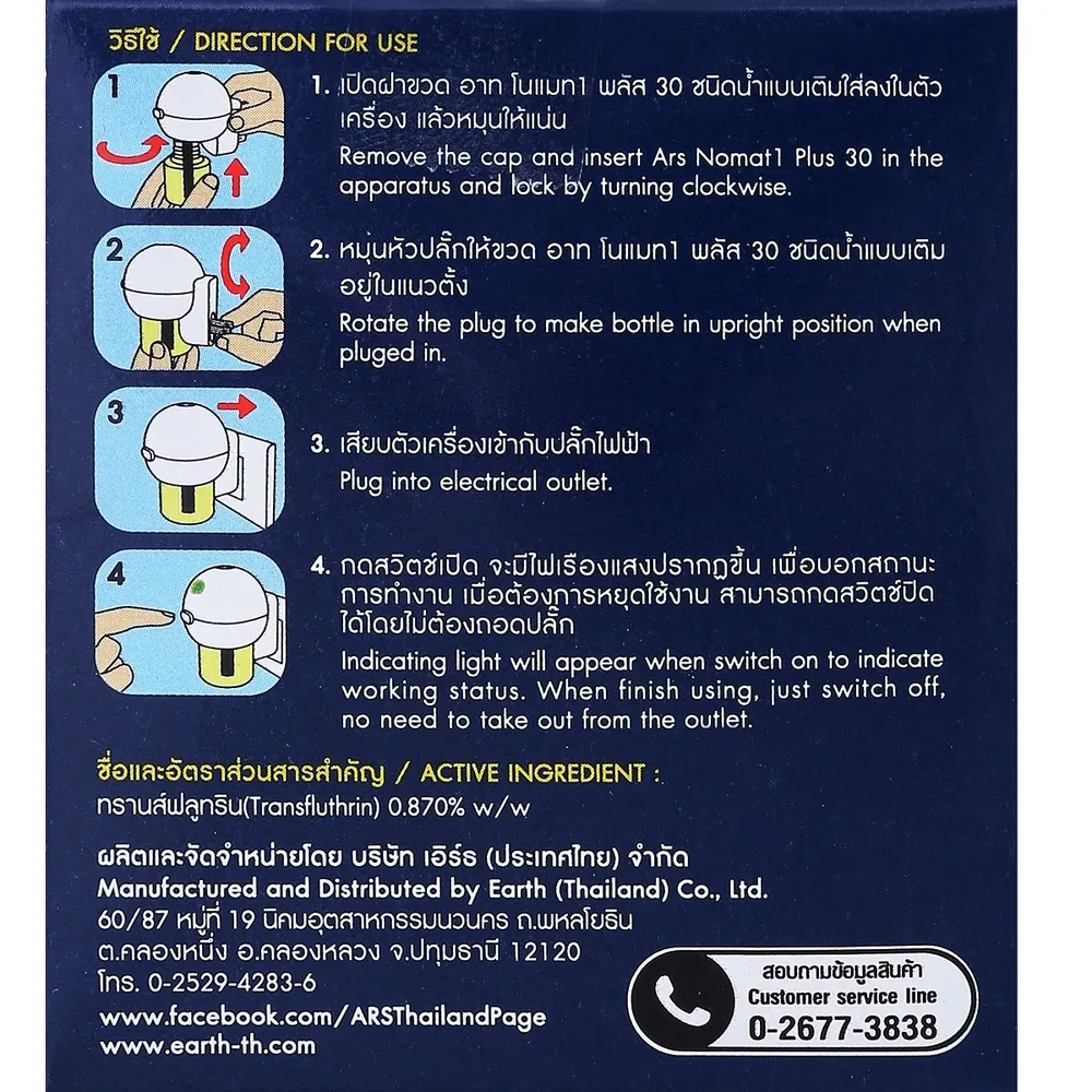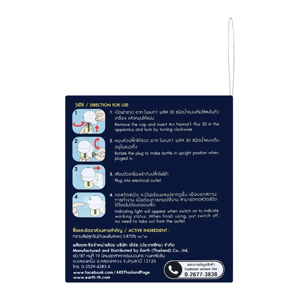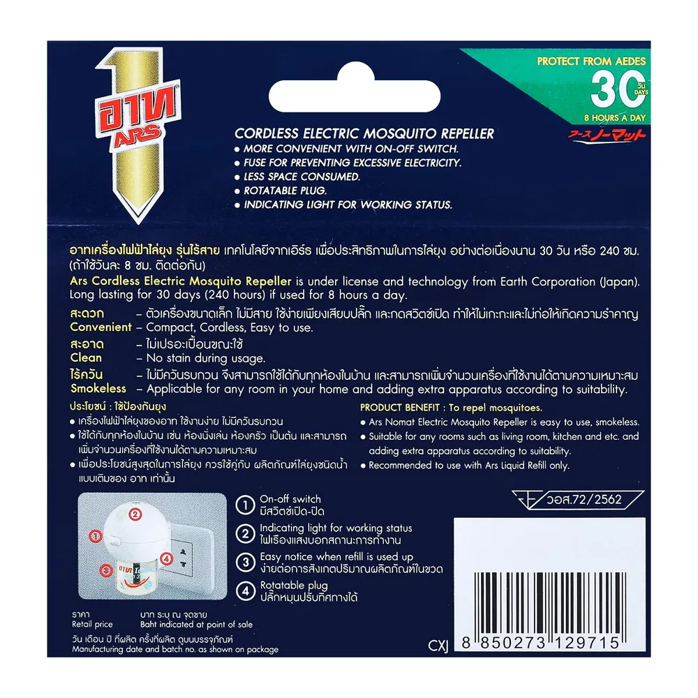 <p>อาท ผลิตภัณฑ์ไล่ยุง ไร้สาย แบบเติม ชนิดน้ำ<br /> <br /> อาท ผลิตภัณฑ์ไล่ยุง ไร้สาย แบบเติม ชนิดน้ำ ผลิตภัณฑ์ป้องกันยุงลาย สะดวกด้วยสวิชต์เปิด-ปิด ใช้งานง่ายโดยมีไฟเรืองแสงแสดงสถานะการใช้งาน ซึ่งมีระยะเวลาการใช้งานอยู่ที่ 30 วัน สามารถปรับทิศทางในการใช้งานได้&nbsp;<br /> <br /> - มีฟิวส์ตัดไฟ<br /> - ประหยัดพื้นที่ใช้สอย<br /> - ปลั๊กหมุนปรับทิศทางได้<br /> - ไฟเรืองแสง บอกสถานะการทำงาน<br /> - ป้องกันจากยุงลาย 30 วัน<br /> <br /> *ภาพประกอบใช้เพื่อการโฆษณาเท่านั้น</p> <br/> <br/> <p><span style="color: #ff0000;" data-teams="true">*บริษัทฯ ขอสงวนสิทธิ์ในการปรับเปลี่ยนราคาจำหน่ายและโปรโมชั่น รวมถึงแพ็คเกจและปริมาณสินค้าจากผู้ผลิตได้ตามความเหมาะสม โดยไม่จำเป็นต้องแจ้งให้ทราบล่วงหน้า </span></p>
