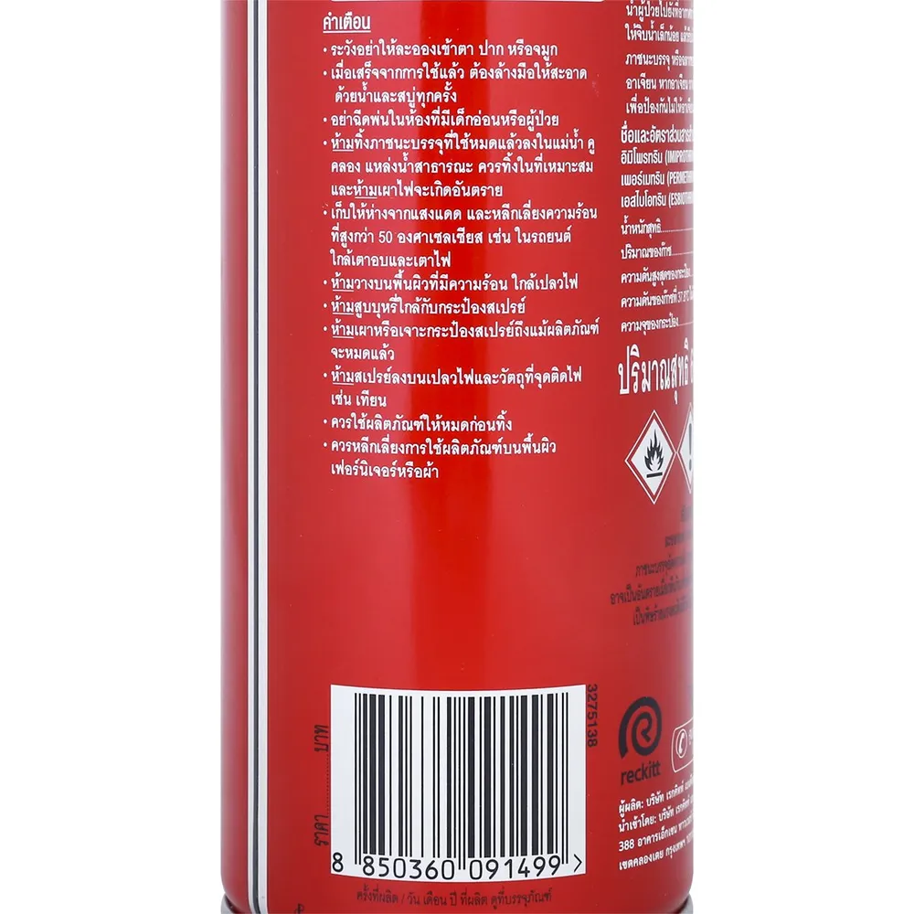 - สำหรับกำจัดยุงที่บินอยู่ในห้อง ก่อนใช้ให้คนและสัตว์เลี้ยงออกจากห้องนั้นก่อน ปิดประตูและหน้าต่าง และให้ผู้ฉีดสวมถุงมือและหน้ากาก หรือใช้ผ้าปิดปากและจมูก เขย่ากระป๋อง แล้วฉีดขึ้นด้านบนห้องทั้ง 4 ด้าน ฉีดประมาณ 15 วินาที ให้ละอองสเปรย์กระจายให้ทั่ว ทิ้งไว้ 15 นาที จึงเปิดระบายอากาศ หรือจะฉีดบริเวณนอกห้องที่ลมสงบก็ได้<br />