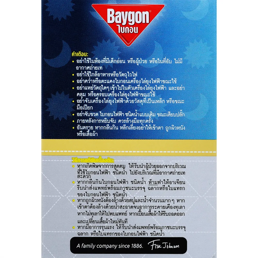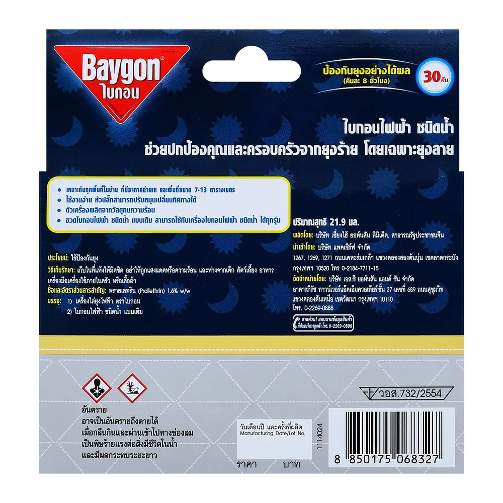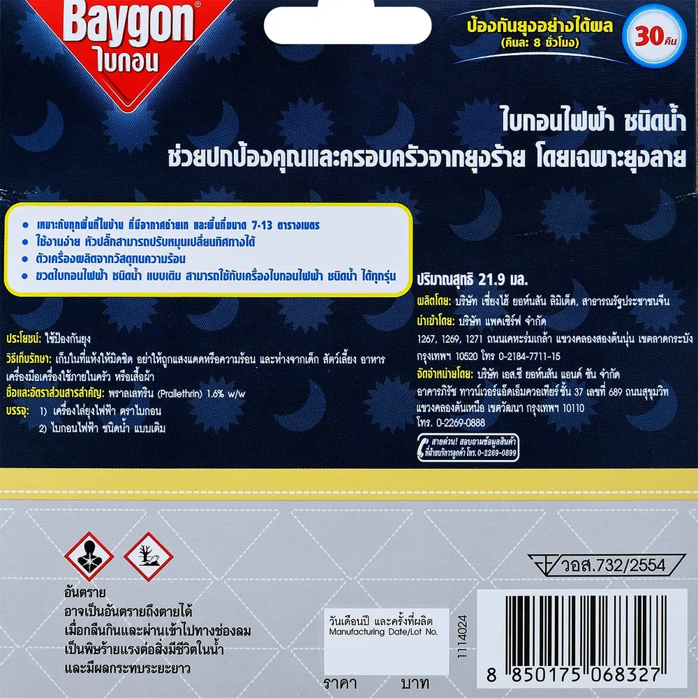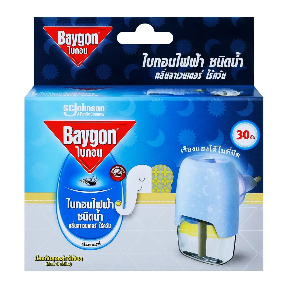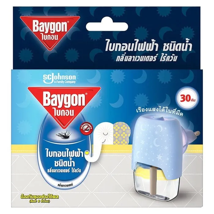 <p>ไบกอน เครื่องไล่ยุงไฟฟ้าชนิดน้ำ กลิ่นลาเวนเดอร์ 30 คืน<br /> <br /> ไบกอน ไฟฟ้าชนิดน้ำ กลิ่นลาเวนเดอร์ ตัวช่วยดีๆ ในการป้องกันคุณและคนที่คุณรักจากยุงร้าย ที่สำคัญคือไม่มีควันรบกวน สามารถใช้ในห้องต่างๆ ที่มีอากาศถ่ายเทสะดวกได้ ต่างจากยาจุดกันยุงแบบขด<br /> <br /> - ไบกอน ไฟฟ้าชนิดน้ำ ไร้ควัน<br /> - เหมาะสำหรับห้องที่มีพื้นที่ขนาดไม่เกิน 7-13 ตารางเมตร<br /> - ดีไซน์สวย เรียบหรู ดูทันสมัย<br /> - ช่วยปกป้องคุณจากยุงที่เป็นพาหะของโรคไข้เลือดออก และแมลงร้าย<br /> - ตัวเครื่องผลิตจากวัสดุทนความร้อน<br /> - ใช้งานง่าย หัวปลั๊กสามารถปรับหมุนเปลี่ยนทิศทางได้<br /> - เครื่องไบกอนไฟฟ้ารุ่นนี้ สามารถใช้กับขวดไบกอนไฟฟ้า ชนิดน้ำแบบเติมได้ทุกรุ่น<br /> - ใช้ได้นานถึง 30 คืน (วันละ 8 ชั่วโมง)<br /> <br /> <strong>วิธีใช้</strong><br /> 1. เปิดฝาขวด ไบกอนไฟฟ้าชนิดน้ำแบบเติม<br /> 2. เสียบขวด ไบกอนไฟฟ้าชนิดน้ำแบบเติม เข้ากับไบกอนเครื่องไล่ยุงไฟฟ้าให้สุด และหมุนเกลียวขวดจนแน่น<br /> 3. นำไบกอนเครื่องไล่ยุงไฟฟ้าเสียบเข้ากับปลั๊กไฟ โดยให้ขวดตั้งตรงหัวปลั๊กสามารถปรับหมุนได้ตามลักษณะของปลั๊กไฟทั้งแนวนอนและแนวตั้ง<br /> 4. ถอดปลั๊กออกหลังจากหยุดใช้งาน<br /> <br /> <strong>วิธีใช้เพื่อให้ได้ประสิทธิภาพดียิ่งขึ้น</strong><br /> - วางไว้เหนือลม<br /> - ไม่วางสิ่งของกีดขวางตัวเครื่อง<br /> - อุ่นเครื่องโดยเสียบไว้ก่อนใช้ 30 นาที<br /> <br /> <strong>วิธีเก็บรักษา</strong><br /> เก็บในที่แห้งมิดชิด อย่าให้ถูกแสงแดดหรือความร้อน และห่างจากเด็ก สัตว์เลี้ยง อาหาร เครื่องมือเครื๋องใช้ภายในครัว หรือ เสื้อผ้า<br /> <br /> <strong>คำเตือน</strong><br /> - อย่าใช้ในห้องที่มีเด็กอ่อน หรือผู้ป่วย หรือในที่อับ ไม่มีอากาศถ่ายเท<br /> - อย่าใช้ใกล้อาหารหรือวัตถุไวไฟ<br /> - อย่าคว่ำหรือตะแคงไบกอนเครื่องไล่ยุงไฟฟ้าขณะใช้<br /> - อย่าแหย่วัตถุใดๆ เข้าไปในตัวเครื่องไล่ยุงไฟฟ้า และอย่าคลุมหรือครอบเครื่องไล่ยุงไฟฟ้าขณะใช้<br /> - อย่าจับขวดไบกอนไฟฟ้าชนิดน้ำแบบเติม ขณะเสียบปลั๊ก<br /> - ภายหลังการหยิบจับ ควรล้างมือทุกครั้ง<br /> - อันตราย หากกลืนกิน หลีกเลี่ยงอย่าให้เข้าตา ถูกผิวหนังหรือเสื้อผ้า<br /> <br /> <strong>วิธีแก้พิษเบื้องต้น</strong><br /> - หากเกิดพิษจากการสูดดม ให้รีบนำผู้ป่วยออกจากบริเวณที่ใช้ไบกอนไฟฟ้า ชนิดน้ำ ไปยังบริเวณที่มีอากาศถ่ายเทสะดวก<br /> - หากกลืนกินไบกอนไฟฟ้าชนิดน้ำ ห้ามทำให้อาเจียน รีบนำส่งแพทย์พร้อมภาชนะบรรจุ ฉลาก หรือใบแทรกของไบกอนไฟฟ้า ชนิดน้ำ<br /> - หากถูกผิวหนังต้องล้างด้วยสบู่และน้ำจำนวนมากๆ หากเข้าตาต้องล้างด้วยน้ำสะอาดจนอาการระคายเคืองทุเลา หากไม่ทุเลาให้ไปพบแพทย์ หากเปื้อนเสื้อผ้าให้รีบถอดออ