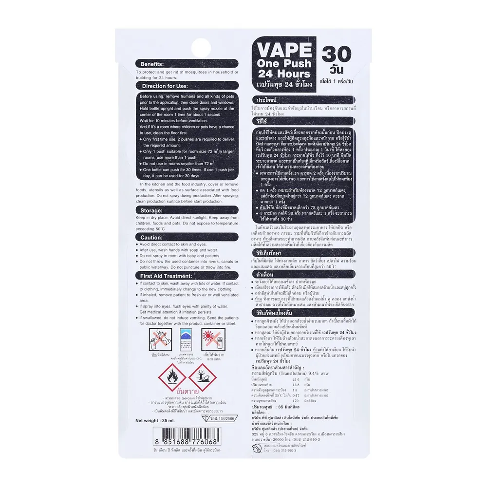 เวป วันพุช 24 ชม. สเปรย์กำจัดยุง มาพร้อมหัวฉีด 5 ทิศทาง และละอองขนาดเล็ก สามารถกระจายทั่วทุกซอบหลืบ กดเพียง 1 ครั้ง ประสิทธิภาพกำจัดยุงได้ทันที และปกป้องยาวนานถึง 24 ชั่วโมง<br />