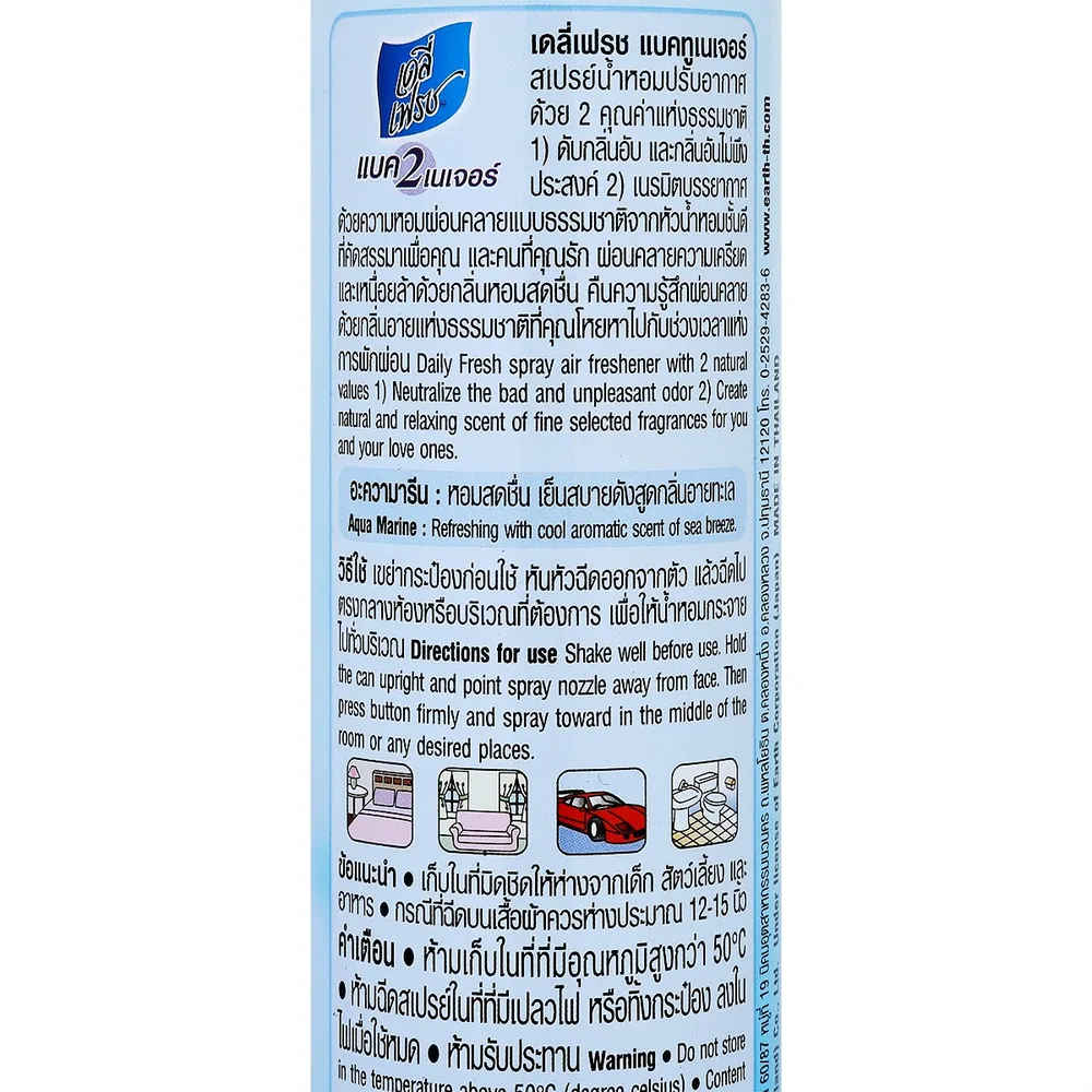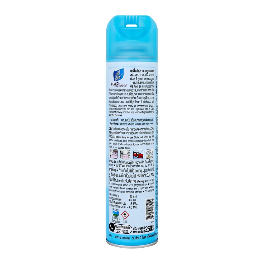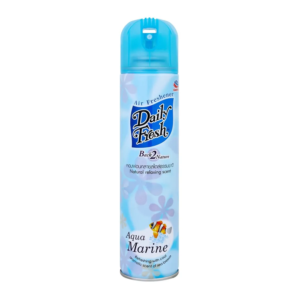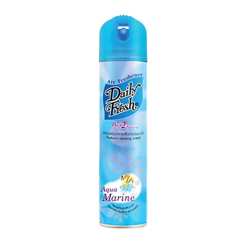 DAILY FRESH สเปรย์ปรับอากาศ ที่สามารถดูดซับกลิ่นอับดีเยี่ยม พร้อมขจัดกลิ่นอันไม่พึงประสงค์ พร้อมให้ความหอมสดชื่นไปทุกอณู ด้วยกลิ่นอความารีน แต่งแต้มสีสันกลิ่นหอม แห่งความสดชื่น เย็นใจเปรียบเสมือนได้ สูดกลิ่นหอมชุ่มช่ำ กลิ่นอายทะเล ให้ความรู้สึกผ่อนคลาย มีความสุขได้ทุกเวลา<br />