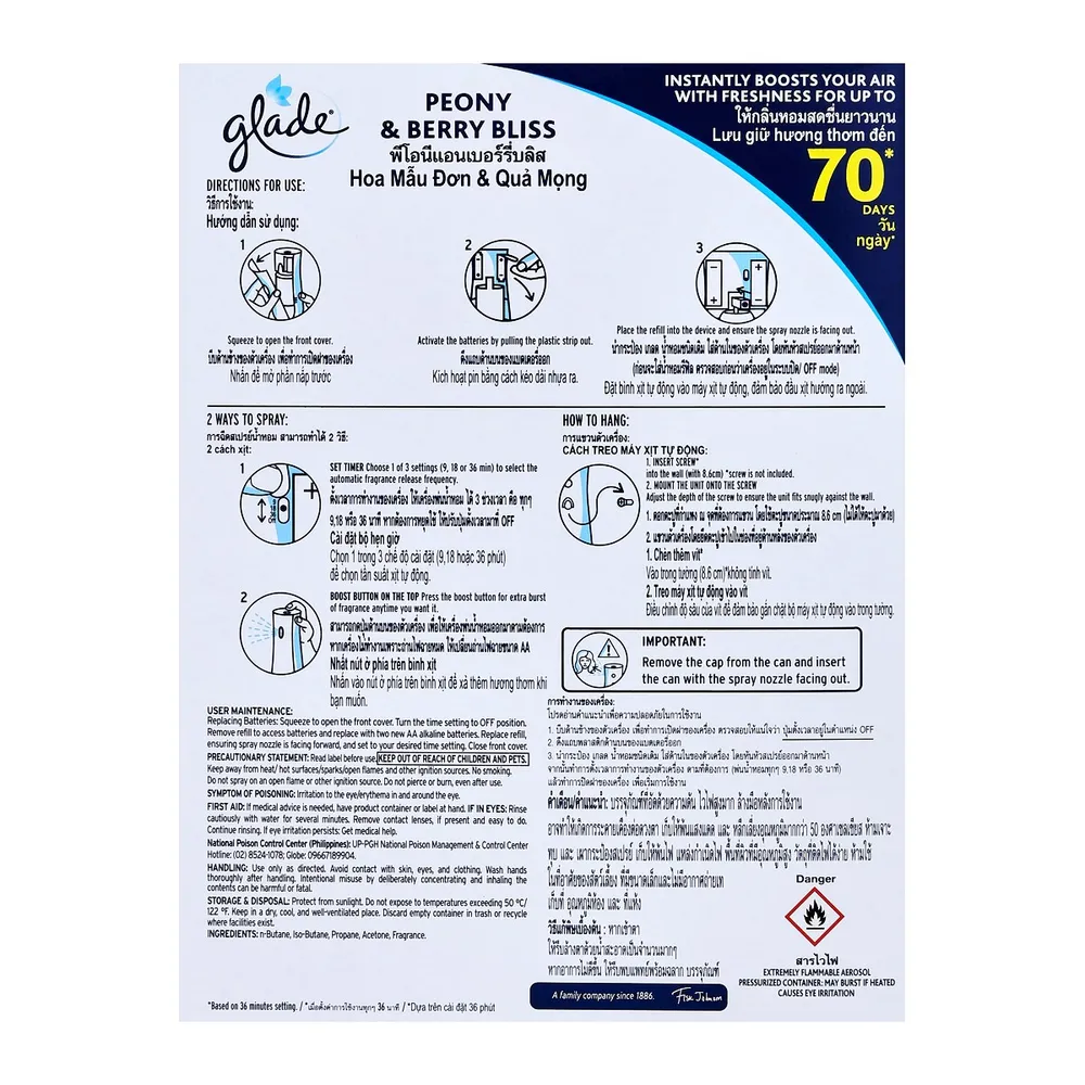 สร้างช่วงเวลาและประสบการณ์สุดพิเศษอันน่าประทับใจให้กับทุกคนในครอบครัว ด้วย เกลด ออโตเมติค สเปรย์ปรับอากาศ กลิ่นพีโอนีแอนด์เบอร์รี่บลิส ที่ให้ละอองสเปรย์กลิ่นหอมที่อ่อนโยนต่อเนื่องยาวนาน สามารถใช้งานได้ในทุกที่ที่ต้องการ<br />