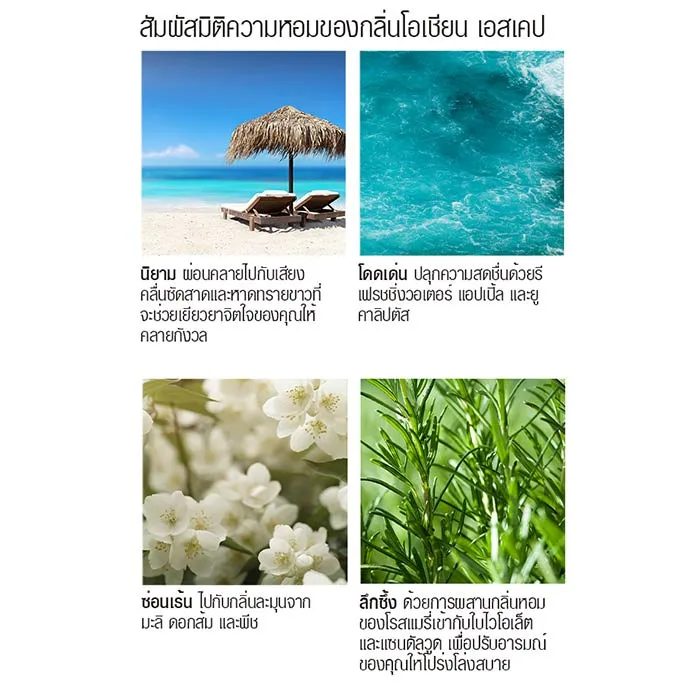 - หอมกลิ่นดอกมูเกต์ แอปเปิ้ลเขียว และเมลอนผสมผสานกับไม้จันทน์และพีช ให้กลิ่นที่ให้ความรู้สึกผ่อนคลาย ราวกับว่าคุณกำลังนั่งฟังเสียงคลื่นซัดสาด<br />