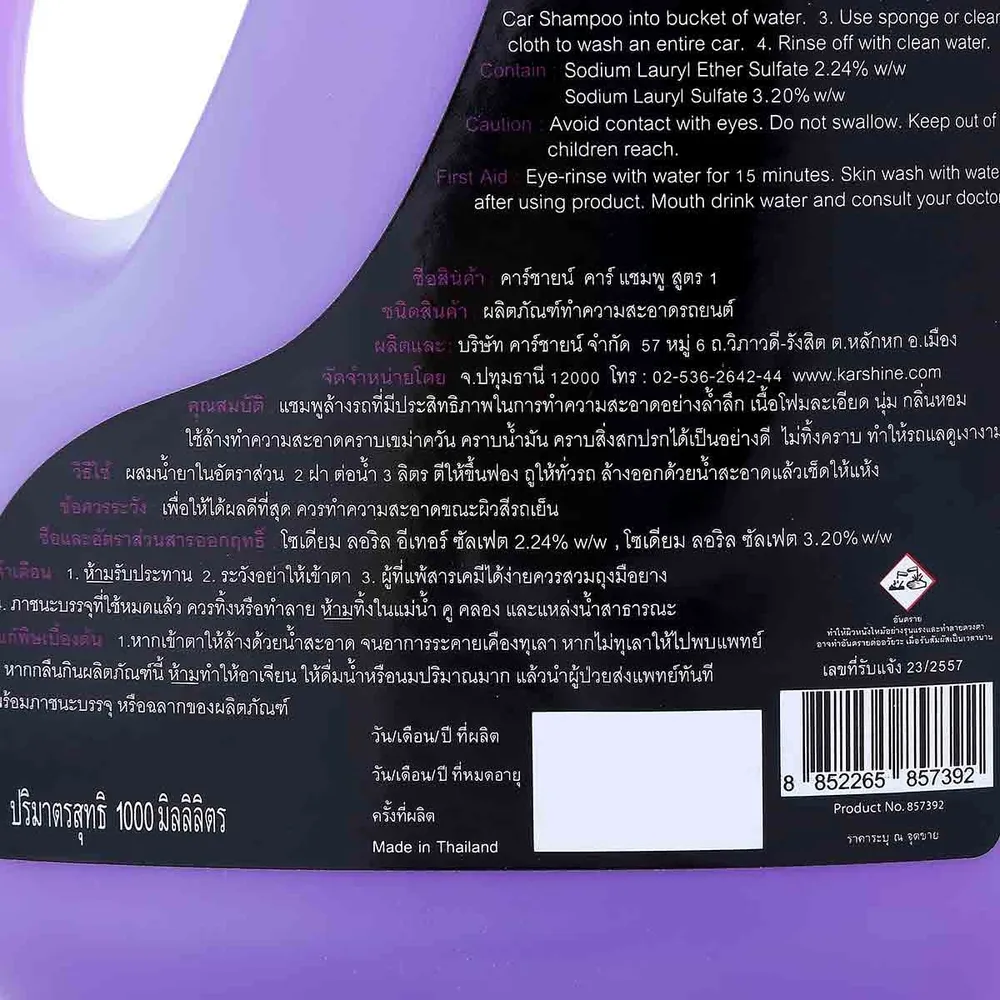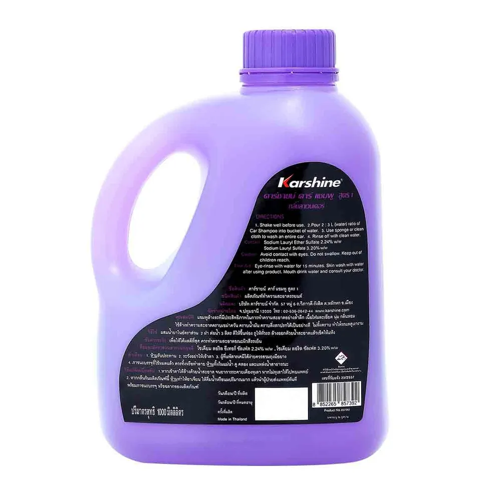 Karshine แชมพูล้างรถ ประสิทธิภาพในการทำความสะอาดเป็นเยี่ยม สำหรับล้างภายนอกสำหรับรถยนต์ได้ทุกประเภท ขจัดสิ่งสกปรกต่างๆที่เกาะอยู่บนผิวรถยนต์ออกไปอย่างง่ายดาย ช่วยให้ผิวสีรถยนต์ดูเงางามเหมือนใหม่ตลอดเวลา เนื้อโฟมมีความละเอียด กลิ่นลาเวนเดอร์ ทำความสะอาดได้ง่ายและช่วยประหยัดเวลา<br />