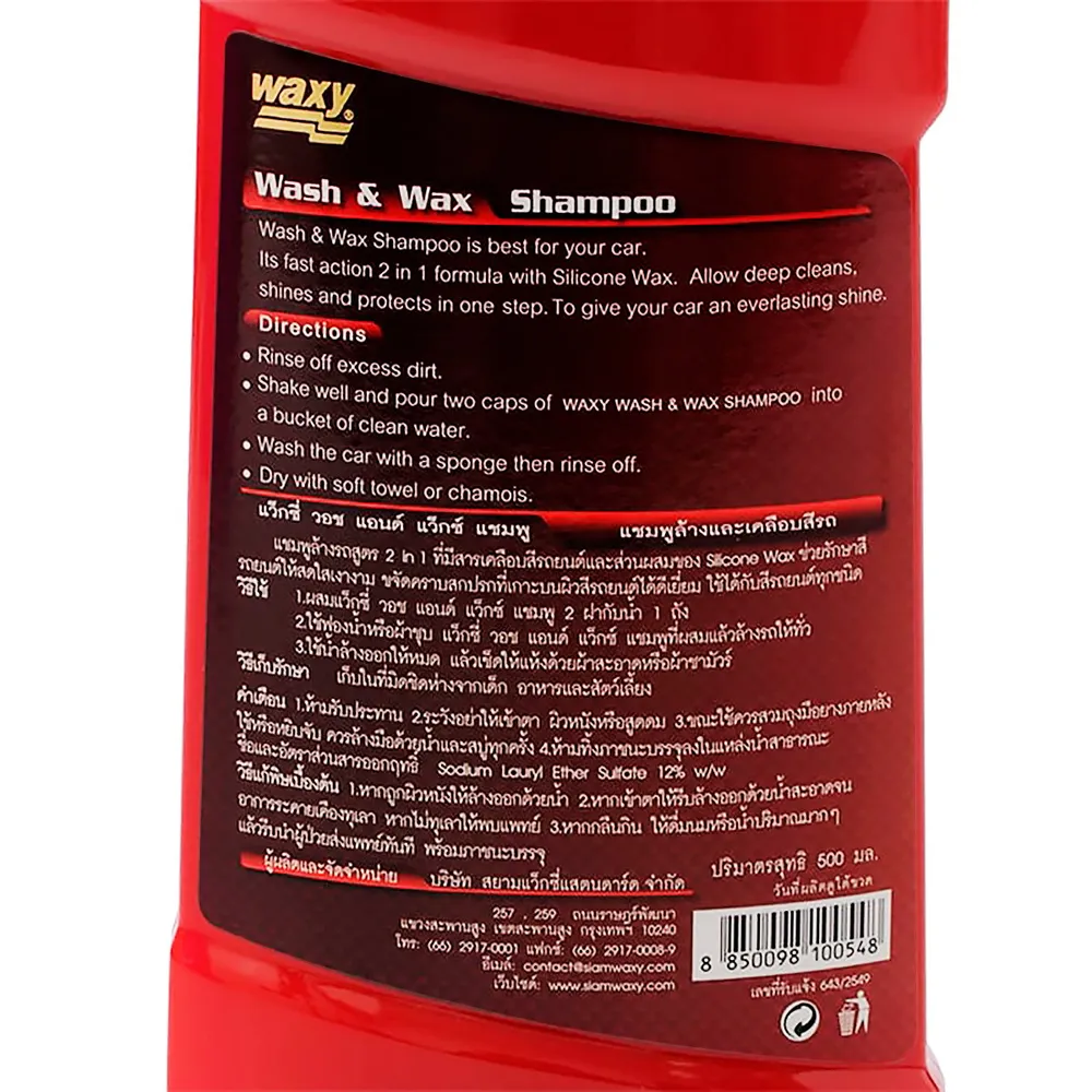 <p>แว็กซี่ แชมพูล้าง และเคลือบสีรถ 500 มล.<br /><br />แว็กซี่ แชมพูล้าง และเคลือบสีรถ ตัวช่วยในการดูแลรถที่มาในรูปแบบ 2 in 1 Waxy Wash &amp; Wax สูตรเข้มข้นผสมซิลิโคนแว็กซ์ ใชได้ทั้งล้าง และเคลือบสีรถในขั้นตอนเดียว สามารถล้างทำความสะอาดคราบสกปรก เขม่า และฝุ่นละอองต่างๆ ที่เกาะพื้นผิวสีรถได้อย่างยอดเยี่ยม<br /><br />- กลิ่นหอมสดชื่น ไม่มีกลิ่นเคมีมากวนใจ<br />- มีส่วนซิลิโคนแว็กซ์ที่อยู่ในตัวน้ำ<br />- สามารถช่วยเคลือบรักษาพื้นผิวสีรถ<br />- เพิ่มความเงางามให้กับรถดูเหมือนใหม่อยู่เสมอ<br /><br /><span style="color: #ff0000;">สินค้าที่ได้รับอาจมีการปรับเปลี่ยนแพ็คเกจและปริมาณจากผู้ผลิต ขออนุญาตสงวนสิทธิ์ในการเปลี่ยนแปลงดังกล่าว โดยไม่แจ้งให้ทราบล่วงหน้า</span><br /><br />*ภาพประกอบใช้เพื่อการโฆษณาเท่านั้น</p>