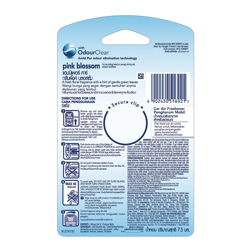 น้ำหอมปรับอากาศรถยนต์ Ambi Pur เปลี่ยนบรรยากาศรถยนต์ให้หอมสดชื่น สัมผัสกับประสบการณ์ความ ของ กลิ่นพิงค์ บลอสซั่ม ได้ความหอมยาวนานมากยิ่งขึ้น เหมือนอยู่ท่ามกลางสวนดอกไม้ แอมบิเพอร์ สามารถขจัดกลิ่นเหม็นภายในรถยนต์ และช่วยปรับอากาศภายในให้สดชื่น ให้ทุกท่านสัมผัสประสบการณ์ความหอมรูปแบบที่ไม่ซ้ำใคร<br />