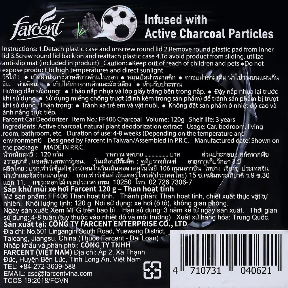 ฟาร์เซ็นท์ เจลคาร์บอน ขจัดกลิ่นบุหรี่ในรถยนต์ ผลิตภัณฑ์ดูแลบ้านและน้ำหอมปรับอากาศพรีเมียม จากประเทศไต้หวัน ที่ผลิตจากวัสดุคุณภาพดี เหมาะสำหรับให้ขจัดกลิ่นบุหรี่ภายในรถยนต์หรือบ้าน<br />