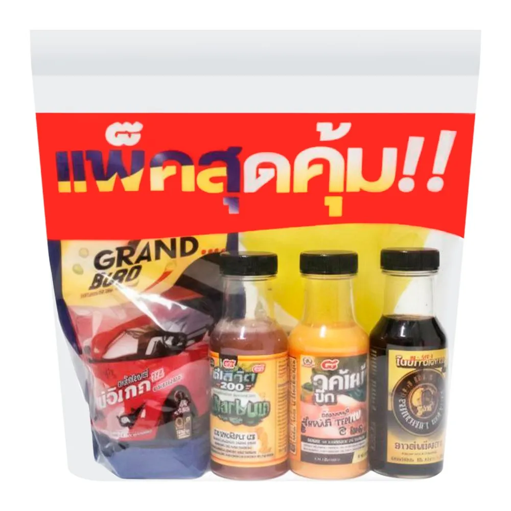- 1 ชุดมี 5 ชิ้น ประกอบด้วย แชมพูล้างรถ, น้ำเคลือบเงาเบาะหนัง, น้ำยาเคลือบสี, น้ำยาเคลือบเงายางดำ, ฟองน้ำล้างรถรูปทรงเลข 8<br />