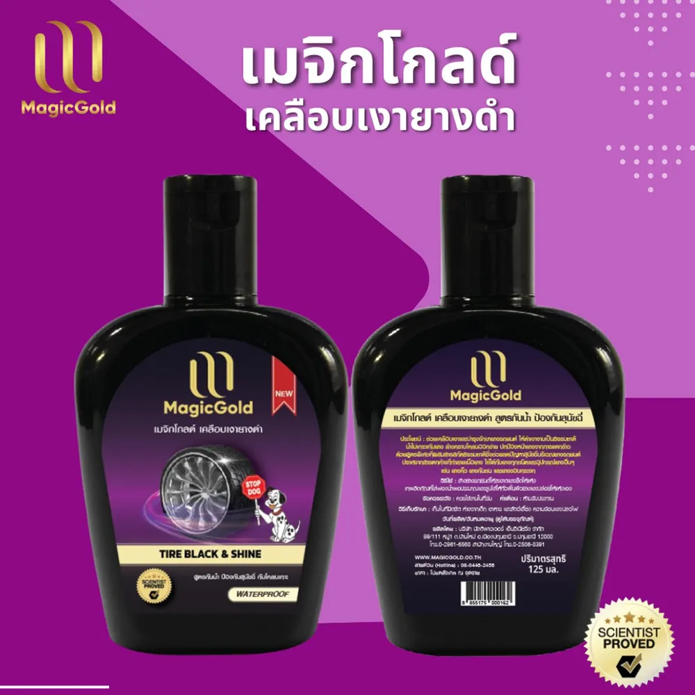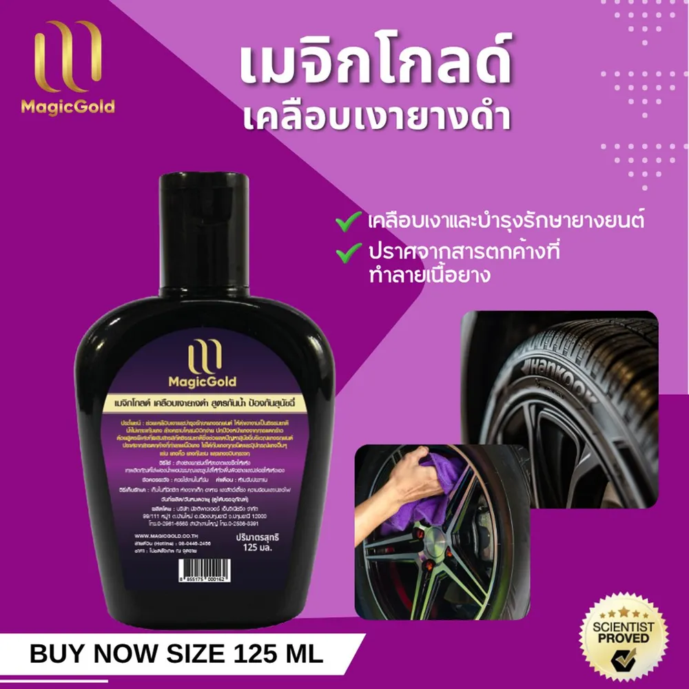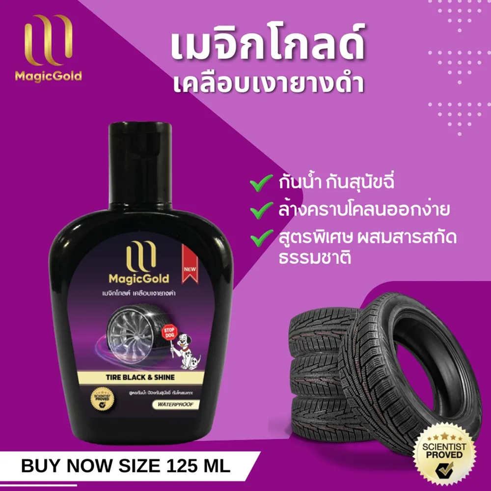 เมจิกโกลด์ เคลือบเงายางดำ ช่วยเคลือบเงาและบำรุงรักษายางรถยนต์ ให้ดำเงางามเป็นธรรมชาติ น้ำไม่เกาะแก้มยาง ล้างคราบโคลนออกง่าย ปกป้องหน้ายางจากการแตกร้าว ด้วยสูตรพิเศษที่ผสมสารสกัดธรรมชาติ ซึ่งช่วยป้องกันสุนัขฉี่บริเวณแก้มยางรถยนต์ ปราศจากสารตกค้างที่ทำลายเนื้อยาง ใช้ได้กับยางทุกชนิดและอุปกรณ์ยางอื่น ๆ เช่น ยางคิ้ว ยางกันชน และยางขอบกระจก<br />