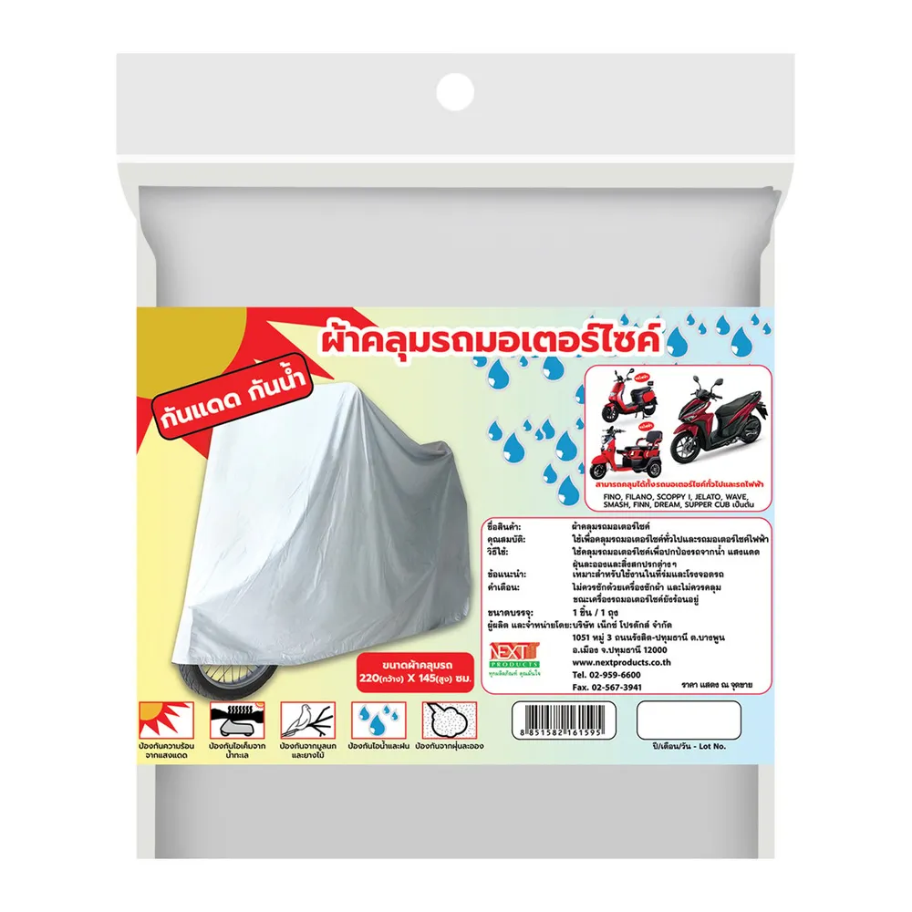 เน็กซ์โปรดักส์ ผ้าคลุมรถมอเตอร์ไซค์ ที่สามารถใช้คลุมได้ทั้งรถทั่วไปและรถไฟฟ้า มียางยืดเย็บหัวท้ายเพิ่มความแน่นไม่ปลิวเมื่อลมแรง ๆ ผลิตจาก Poly Vinyl Chloride(PVC) ผสมสาร Silver เพื่อการสะท้อนแสงและรังสีความร้อน ป้องกันน้ำ ใช้งานได้ทุกสภาพอากาศ<br />
