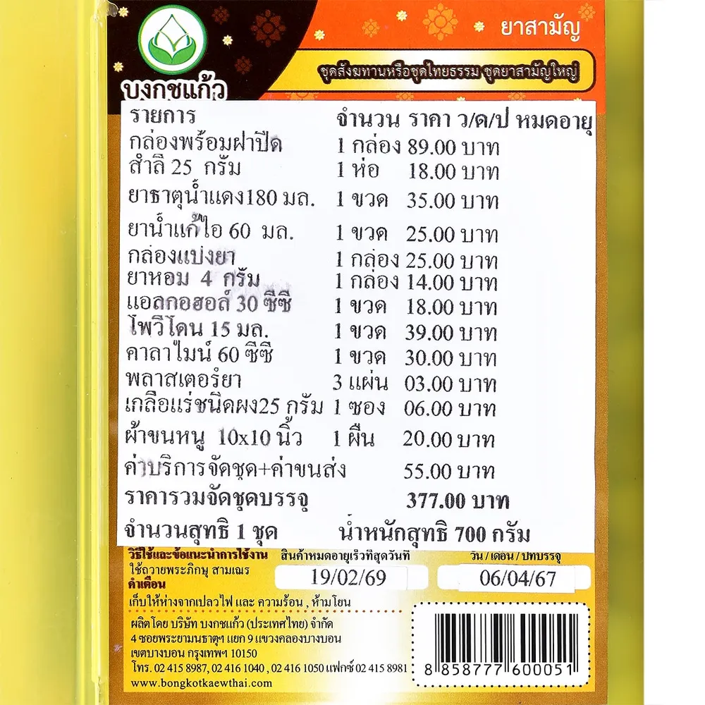 เพื่อการทำบุญในวันสำคัญทางศาสนาได้สุขใจเลือกใช้ บงกชแก้ว ชุดสังฆทานยาสามัญขนาดใหญ่ ซึ่งในชุดประกอบด้วยกล่องพลาสติกพร้อมฝาปิด สำลี ยาธาตุน้ำแดง ยาน้ำแก้ไอ กล่องแบ่งยา ยาหอม แอลกอฮอล์ โพวิโดน 15 คาราไมล์ หมากหอม เครื่องดื่มเกลือแร่ชนิดผง และผ้าขนหนู<br />