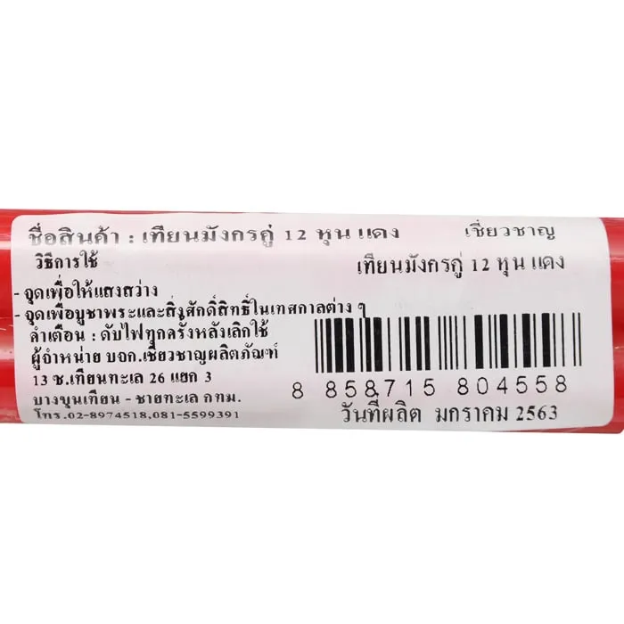 <p>เชี่ยวชาญ เทียนมังกรคู่ 12 หุน สีแดง 1 เล่ม<br /><br />เชี่ยวชาญ เทียนมังกรคู่ 12 หุน สีแดง 1 เล่ม เทียนไขคุณภาพเกรด A ทำจากขี้ผึ้งแท้เวลาจุดไม่มีน้ำตาเทียน ควันน้อย ควันไม่ดำ โดยมีคำอวยพรเพื่อความเป็นศิริมงคลอยู่ที่ตัวเทียน สำหรับใช้จุดเพื่อบูชา หรือใช้ในพิธีกรรมต่างๆ ของคนไทยเชื้อสายจีน<br /><br />- เทียนไขคุณภาพเกรด A<br />- ทำจากขี้ผึ้งแท้ ควันไม่ดำ<br />- ไส้เทียนทำจากคอตตอนแท้ 100%<br />- จุดได้นาน ควันและน้ำตาเทียนน้อย<br /> - ใช้จุดเพื่อบูชา หรือใช้ในพิธีกรรมต่างๆ<br /><br />*ภาพประกอบใช้เพื่อการโฆษณาเท่านั้น</p>