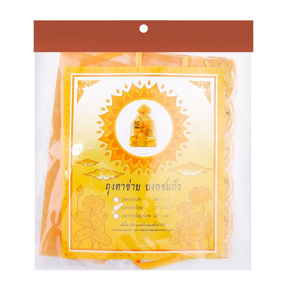 ถุงผ้าตาข่ายสีทอง เหมาะกับการห่อของในงานพิธีการหรือของสำหรับถวายพระ เนื้อผ้าแข็งแรงมีคุณภาพ ใช้งานสะดวก<br />