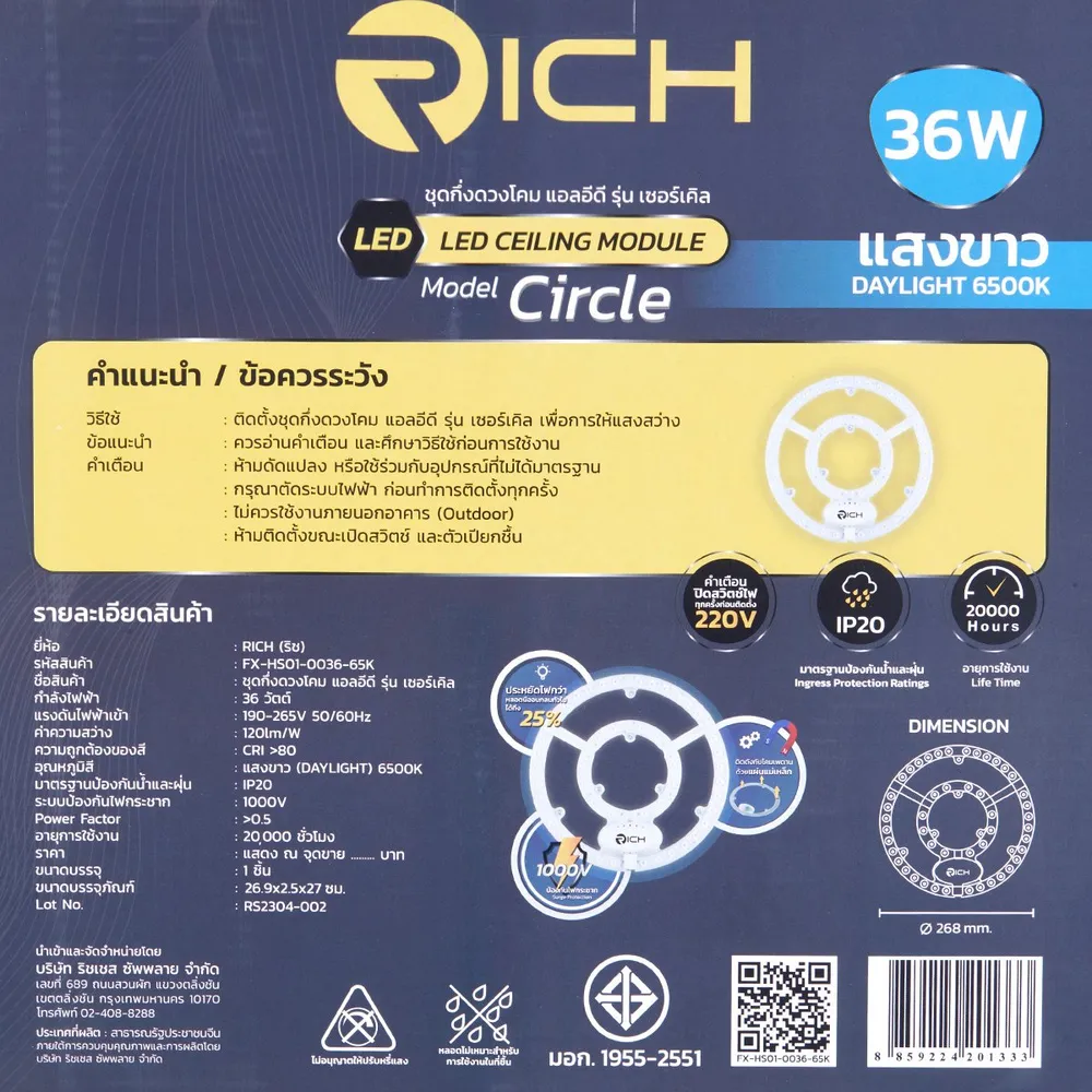 บ้านสว่างสดใสด้วย ริช ชุดกึ่งดวงโคม แอลอีดี รุ่นเซอร์เคิล แสงเดย์ไลท์ ผลิตภัณฑ์ดวงโคมไฟคุณภาพจากแบรนด์ ริช ที่ผลิตจากวัสดุคุณภาพดี ผ่านกรรมวิธีการผลิตที่ได้มาตรฐาน แสงขาว ค่าความสว่าง 120 ลูเมน และอายุการใช้งาน 20,000 ชั่วโมง<br />
