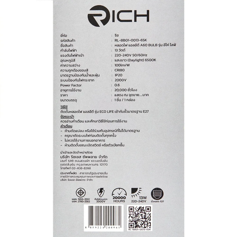 <p>ริช หลอดไฟแอลอีดี รุ่น อีโค่ไลฟ์ 13 วัตต์ แสงขาว เดย์ไลท์ 6500K<br />