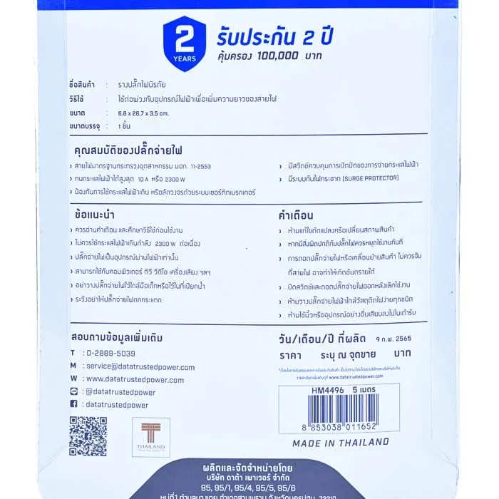 ดาต้า ปลั๊กไฟ 4 ช่อง 4 สวิตช์ สายไฟ 5 ม. รุ่น HM4496M5W สีขาว