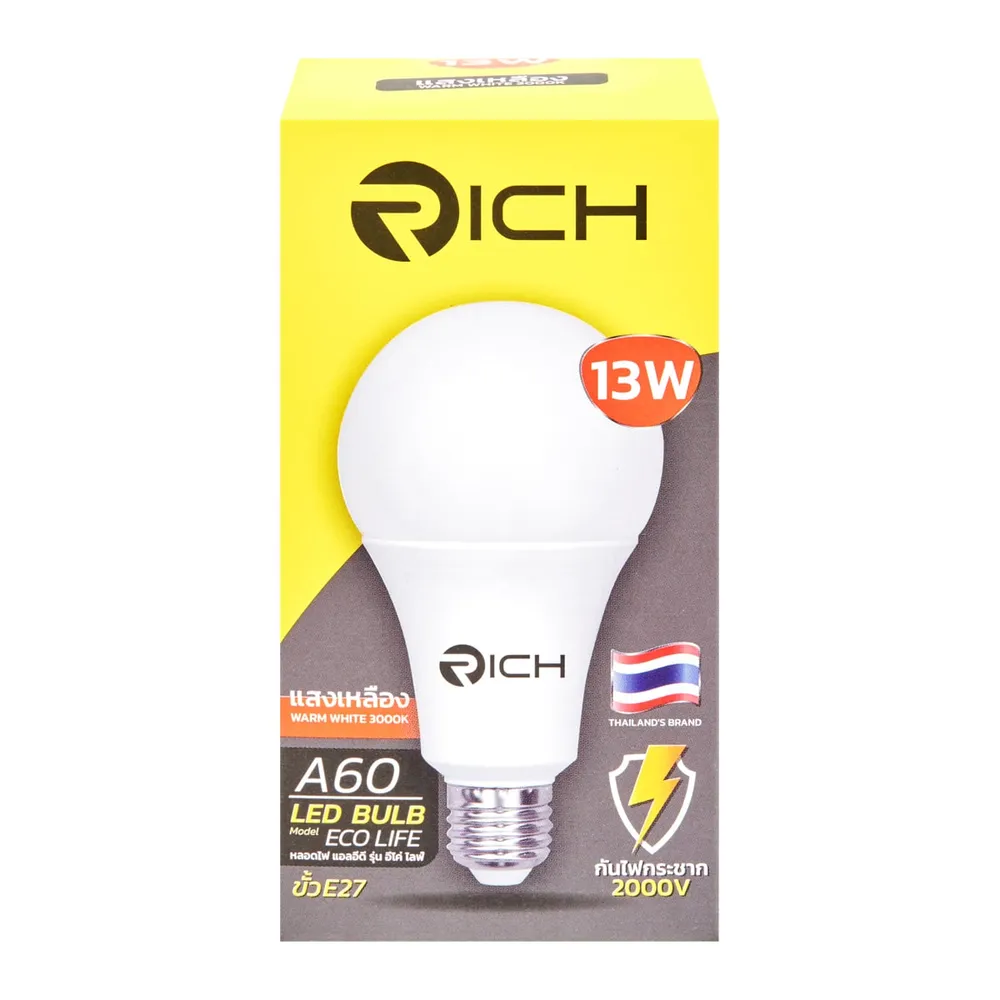 <p>ริช หลอดไฟแอลอีดี รุ่น อีโค่ไลฟ์ 13 วัตต์ แสงเหลือง วอร์ม ไวท์ 3000K<br />