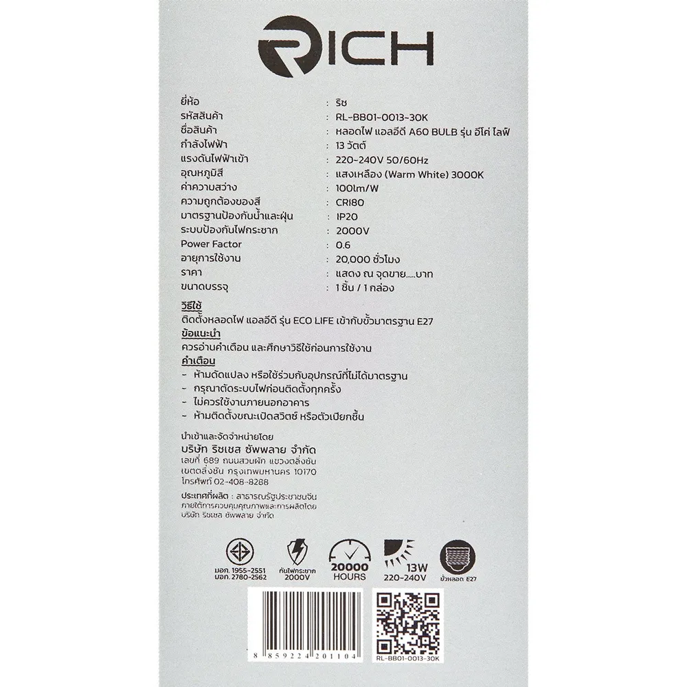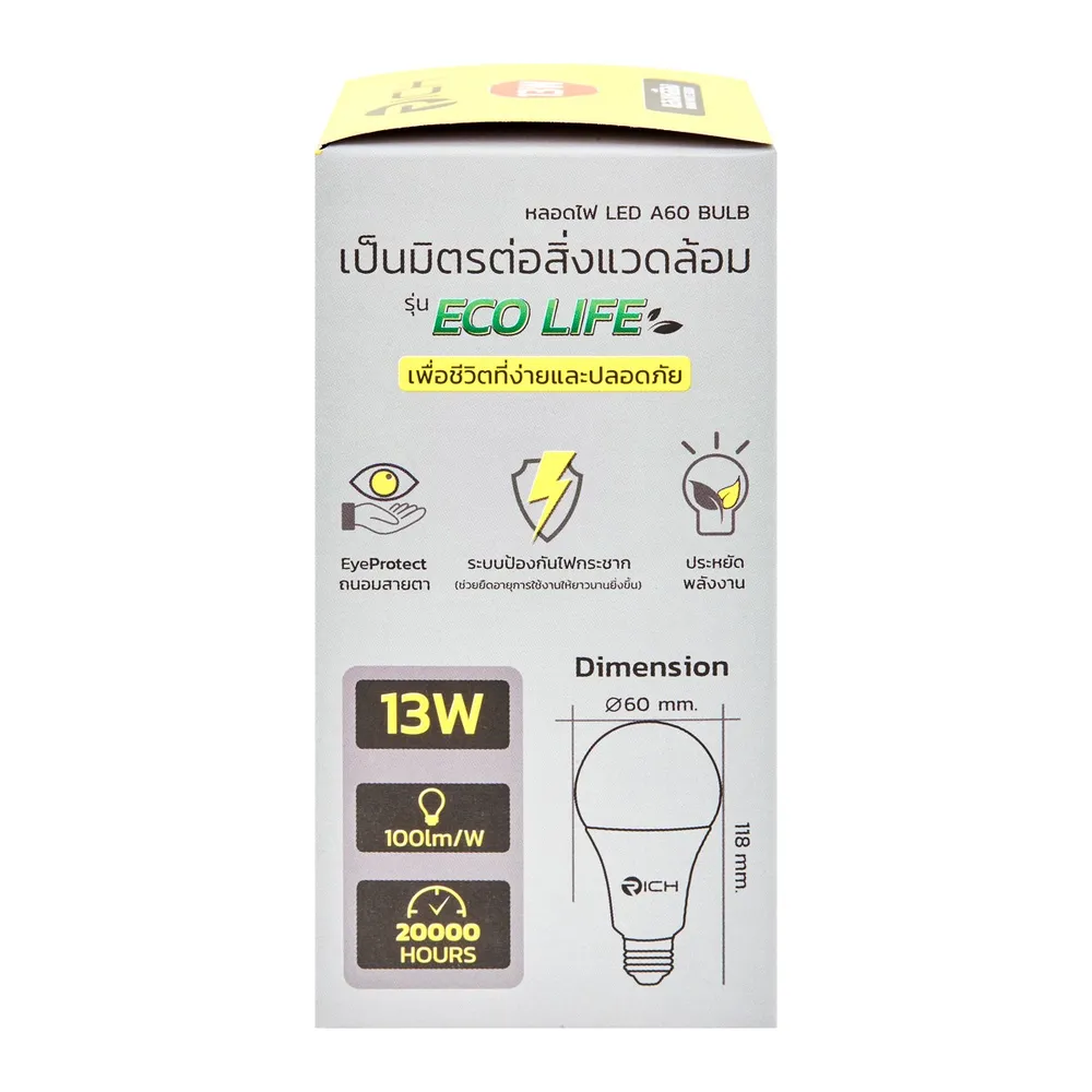 ริช หลอดไฟแอลอีดี รุ่น อีโค่ไลฟ์ 13 วัตต์ แสงเหลือง วอร์ม ไวท์ 3000K